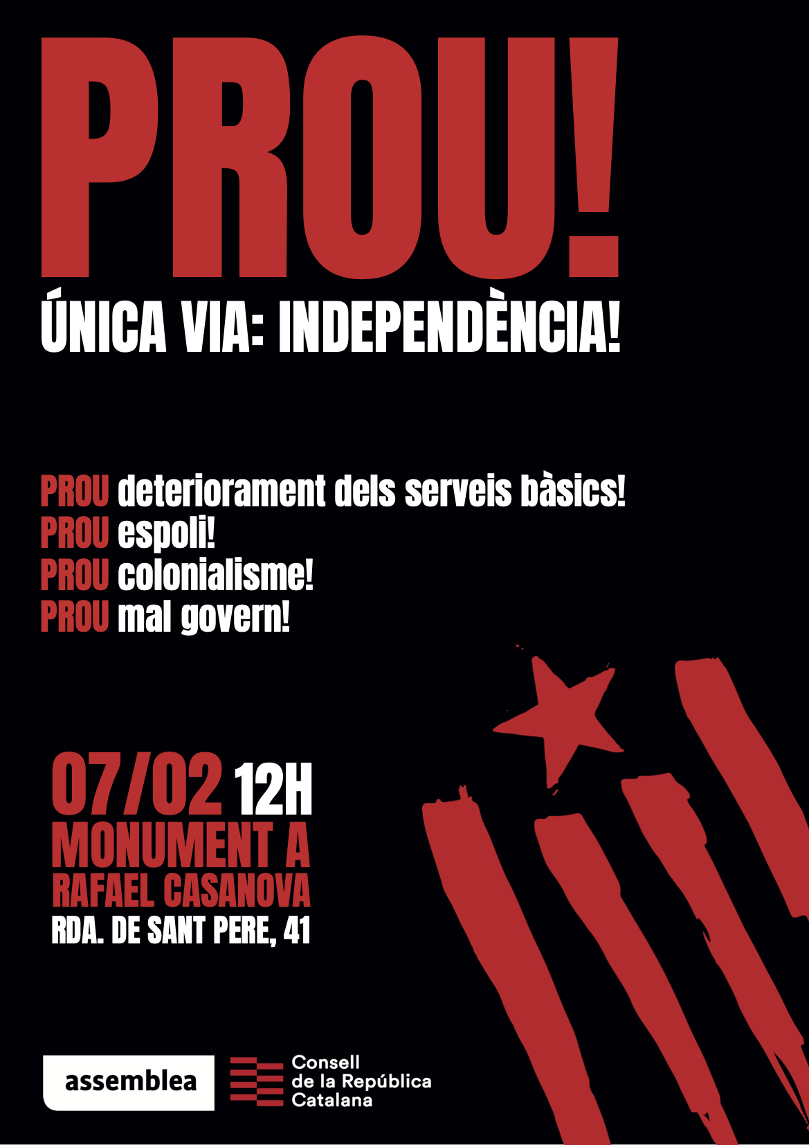 Per això el Consell de la República i l’ANC, les dues entitats que tenen com a únic objectiu avançar cap a la independència, i amb el suport d’Òmnium Cultural, han convocat una macro manifestació el dissabte 7 de febrer a les 12 del migdia a l’Arc de Triomf de Barcelona per dir que ja n’hi ha PROU!