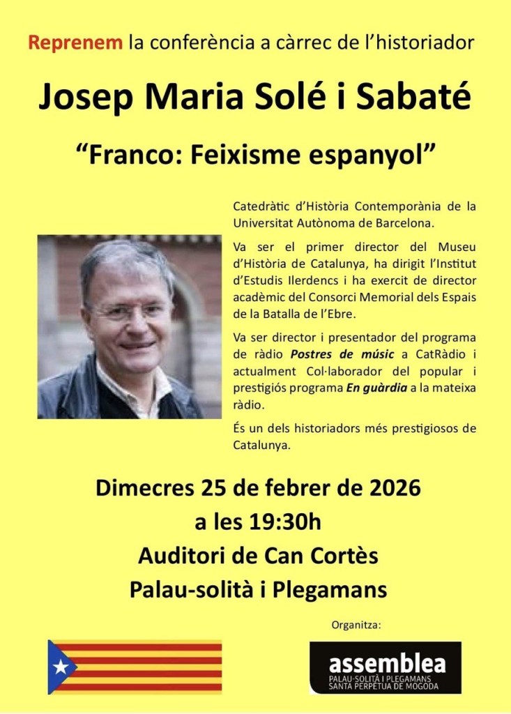 El dimecres 25 defebrer, a Palau-solità i Plegamans, es farà la conferència “Franco: feixisme espanyol“ a càrrec de l’historiador Josep Maria Solé i Sabaté.