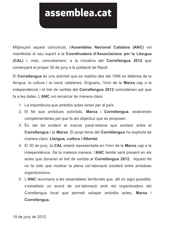 Som a les portes de la primera gran acció de l’ANC, la Marxa cap a la Independència, que ens ha de permetre la consolidació del moviment arreu del país i l’assoliment d’una majoria social favorable a l’Estat propi.