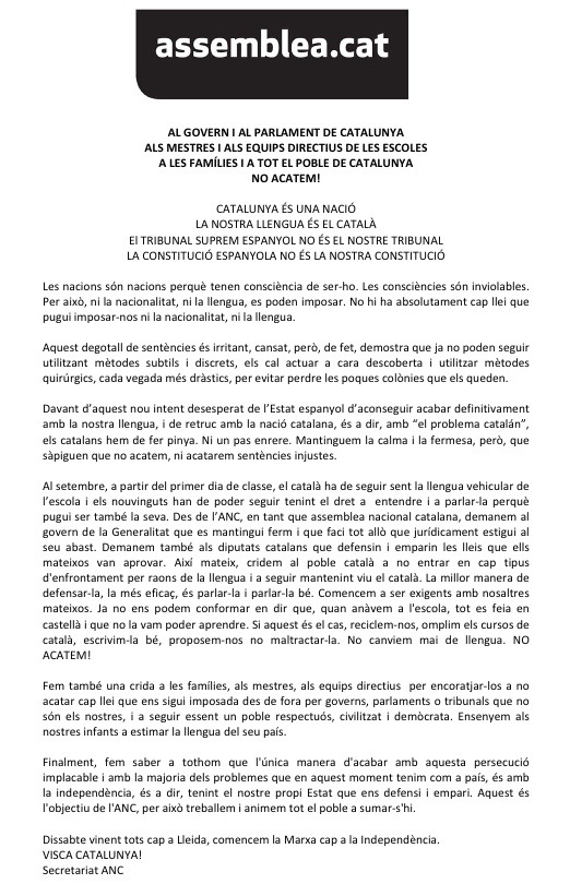 L’Assemblea crida a no acatar la nova sentència contra el català
