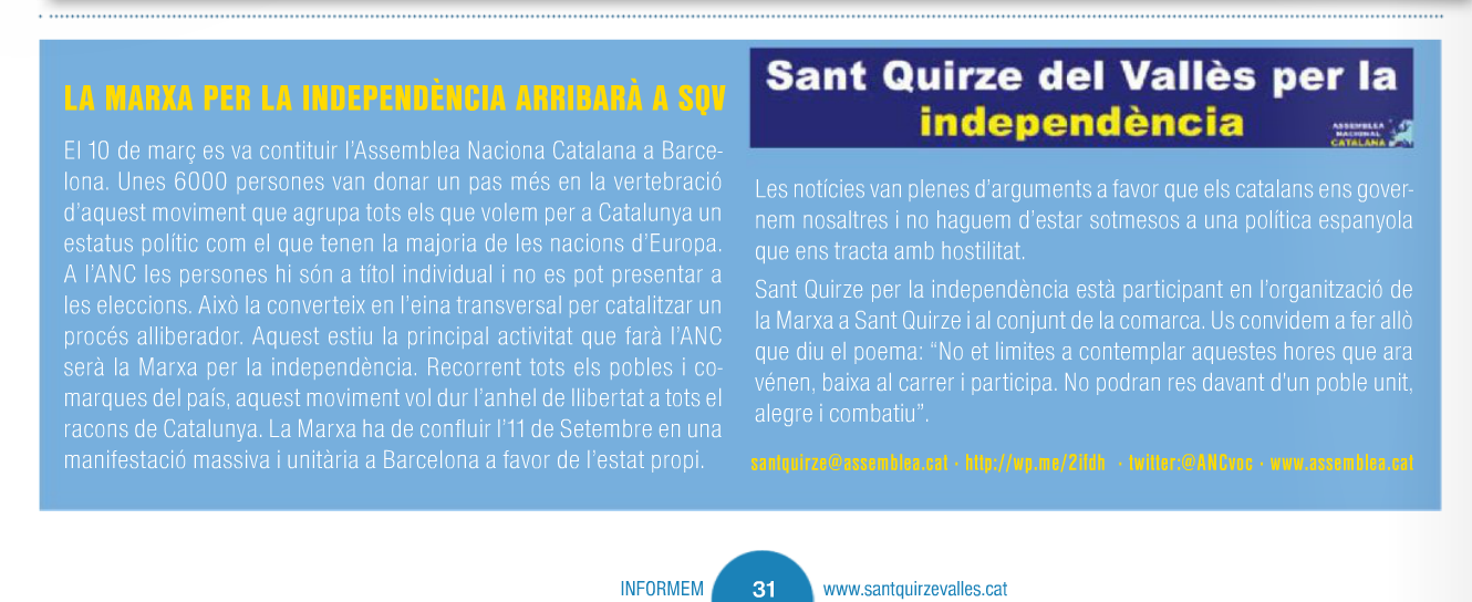 La revista informativa municipal “informem” de maig-juny ha publicat un escrit de Sant Quirze per la independència que serveix per anunciar que la Marxa cap a la independència arribarà al municipi aquest estiu.