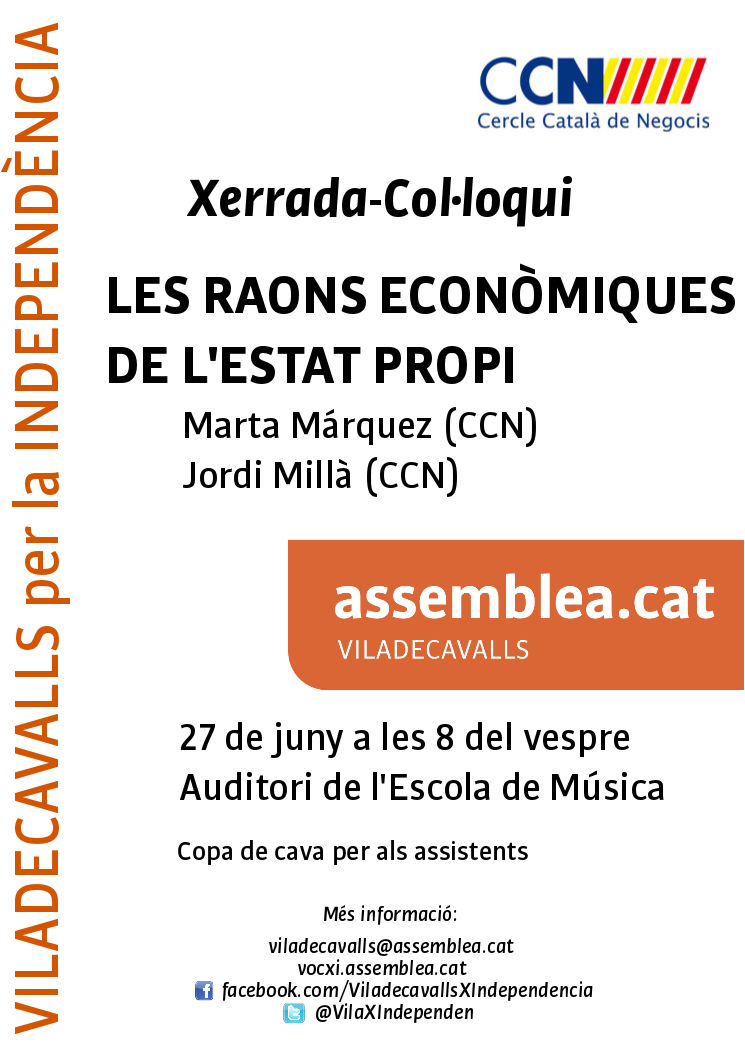 El Cercle Català de Negocis (CCN) i la delegació a Viladecavalls de l’Assemblea Nacional Catalana organitzen conjuntament una xerrada sobre les possibles repercussions econòmiques si Catalunya fos independent. Els ponents, Marta Márquez i Jordi Millà, són membres del Cercle Català de Negocis (CCN), entitat que realitza periòdicament estudis sobre la situació econòmica de Catalunya. El CCN és una associació que agrupa empresaris, directius i professionals que, per tal de garantir el futur del teixit empresarial català, volen disposar d’un Estat propi.