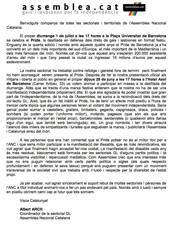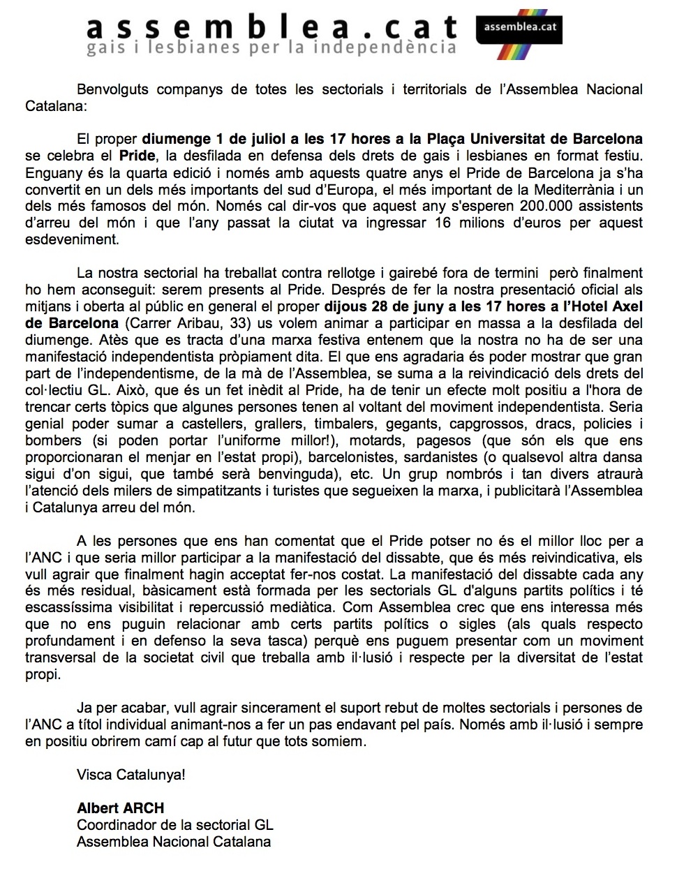 juny 15 2012 La sectorial de gais i lesbianes convoquen l’1 de juliol al Pride de Barcelona Convocatòria de la sectorial gai i lesbiana a la desfilada Pride de Barcelona de l’1 de juliol. Feu clic per enviar un enllaç per correu electrònic a un amic (S'obre en una nova finestra) Correu electrònic Feu clic per compartir al Facebook (S'obre en una nova finestra) Facebook Feu clic per compartir a X (S'obre en una nova finestra) X Feu clic per compartir al WhatsApp (S'obre en una nova finestra) WhatsApp Feu clic per compartir al Telegram (S'obre en una nova finestra) Telegram Feu clic per compartir al Mastodon (S'obre en una nova finestra) Mastodon Més Feu clic per imprimir (S'obre en una nova finestra) Imprimeix Fes clic per compartir al Linkedin (S'obre en una nova finestra) LinkedIn Feu clic per compartir al Tumblr (S'obre en una nova finestra) Tumblr Feu clic per compartir al Pinterest (S'obre en una nova finestra) Pinterest Fes clic per compartir al Reddit (S'obre en una nova finestra) Reddit Feu clic per compartir al Pocket (S'obre en una nova finestra) Pocket M'agrada S'està carregant...