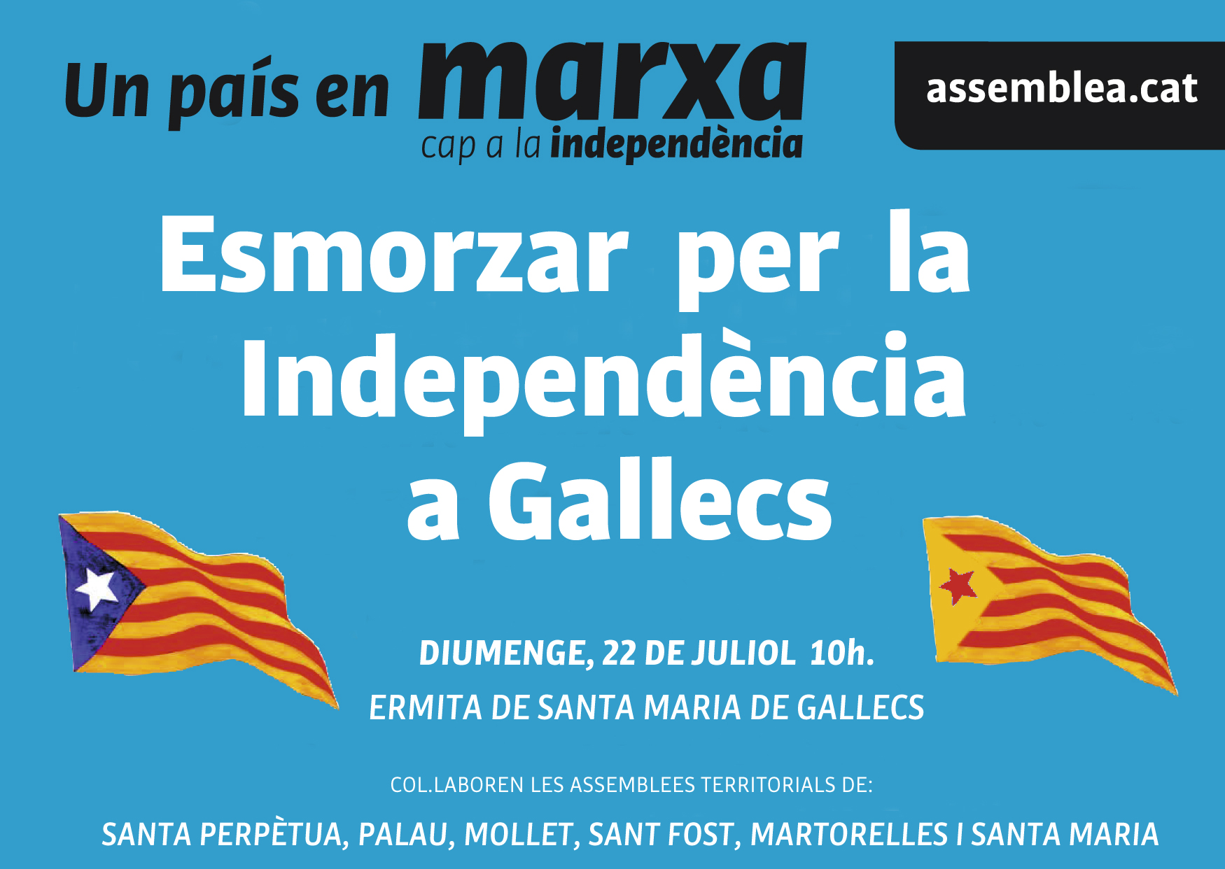 T’agrada passejar o anar en bicicleta els diumenges al matí? Doncs aquest diumenge tens una cita a la Plaça del Ajuntament (de Santa Perpètua de Mogoda) a les 8:30h. Anirem fins a Gallecs i allà ens trobarem als companys de Mollet, Palau-Solità i Plegamans, Sant Fost, Martorelles i Santa Maria per fer un esmorzar de suport a la Marxa cap a la independència.