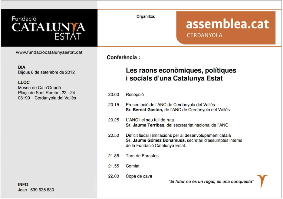 Dijous 6 de setembre a les 20 hores, al museu de Ca n’Ortadó de Cerdanyola (Plaça de Sant Ramon, 23 – 24),es farà la Conferència “Les raons econòmiques, polítiques i socials d’una Catalunya Estat “amb les intervencions d’en Jaume Terribas (membre electe del Secretariat de l’ANC) i d’en Jaume Gómez (Secretari d’assumptes interns de la Fundació Catalunya Estat). El futur no és un regal, és una conquesta.Us hi esperem!