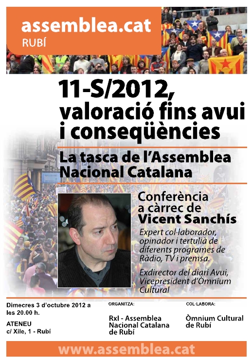 Després d’una introducció en la que des de l’ANC de Rubí presentarà la tasca que està fent des de Rubí, en Vicent Sanchís ens parlarà de com ha canviat el país des de la manifestació de l’onze de setembre i com veu les conseqüències d’aquesta en el nostre futur com a país. En Vicent, vicepresident d’Òmnium Cultural i ex-director del diari Avui, és un habitual tertulià i col·laborador en diferents programes de televisió, ràdio i premsa.