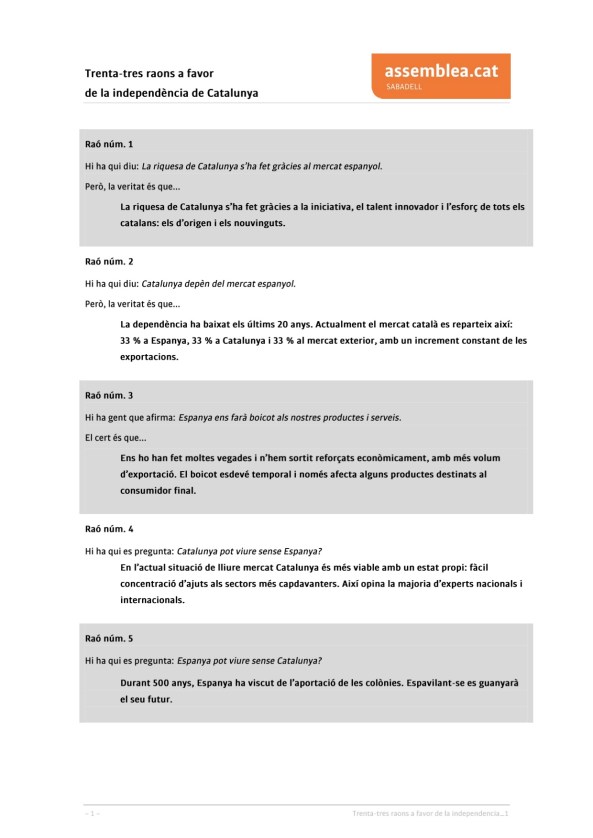 Sabadell per la independència ha fet un document amb 33 respostes a qüestions sobre la independència de Catalunya.