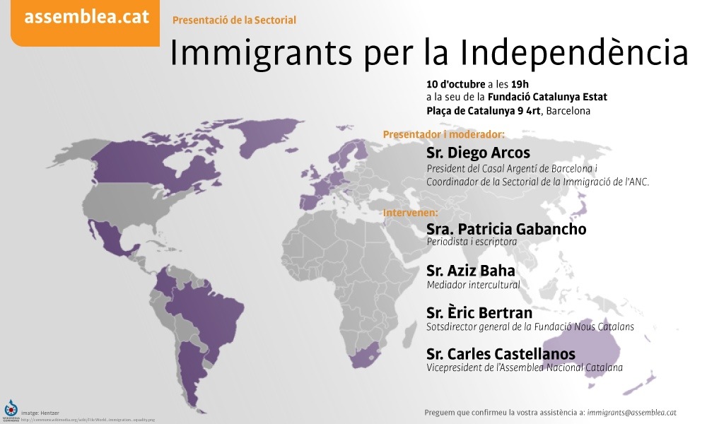 Ens complau convidar-li a l’acte de presentació de la Sectorial de la Immigració de l’ANC el proper 10 d’octubre, a la seu de la Fundació Catalunya Estat, Plaça de Catalunya 9, 4rt pis, 08002 Barcelona, a les 19h.