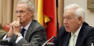 GRA210. MADRID, 11/10/2012. El ministro de Asuntos Exteriores y Cooperación, José Manuel García Margallo (d), y del titular de Defensa, Pedro Morenés (i), durante su comparecencia ante la Comisión de Asuntos Exteriores, esta tarde en el Congreso. EFE/J.J. Guillén