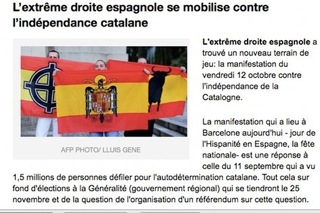 Le Monde es fa ressò avui de la concentració espanyolista de Barcelona en el bloc ‘Droite(s) extreme(s)’ i titula que ‘l’extrema dreta espanyola es manifesta contra l’independentisme català’. Els autors de l’article apunten que l’extrema dreta espanyola ha aprofitat la concentració d’avui per tornar a sortir al carrer, i esmenta concretament la Falange, l’MRS i Plataforma per Catalunya. Recorden que la dreta espanyola sempre ha estat contrària a la independència de qualsevol territori i que justament aquest és el pal de paller de la campanya electoral del PP de cara al 25 de novembre.