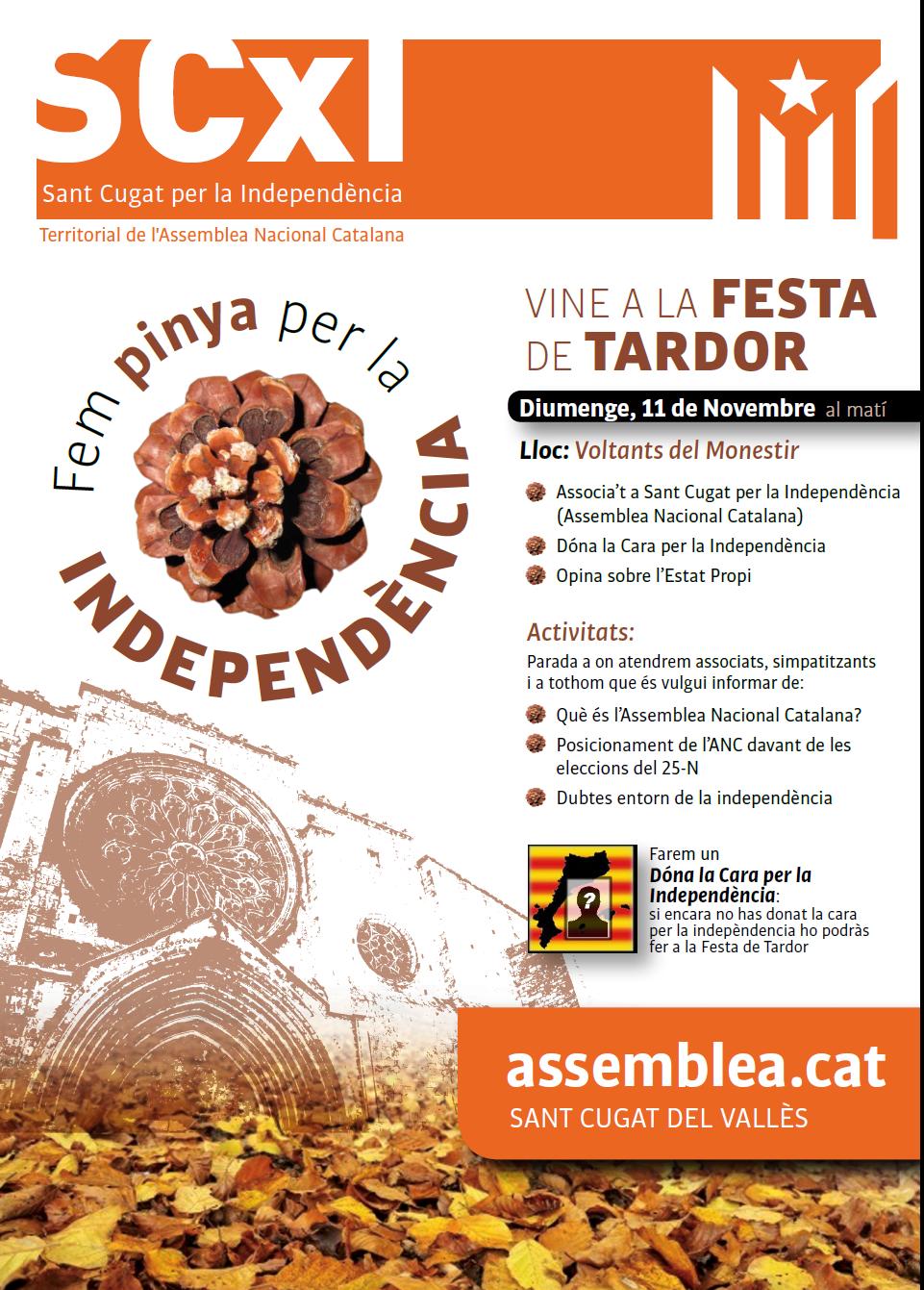 Per això establirem un acord de col·laboració, que de moment ja hem encetat amb la presentació de la primera iniciativa conjunta: un manifest de la societat santcugatenca per donar suport a la Resolució del Parlament de Catalunya perquè el poble català pugui decidir democràticament el seu futur. Aprofitant que aquest cap de setmana se celebra la Festa de Tardor, començarem a demanar el suport de la vuitantena d’entitats que hi participen.