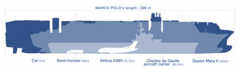 Aquest mes de novembre ha començat a navegar el Marco Polo, el vaixell de càrrega més gran del món. Construït per Daewoo Shipbuilding & Marine Engineering a Corea del Sud, el 7 de novembre va sortir de la Xina cap a Europa en el seu primer trajecte. El megavaixell de la companyia marítima CMA CGM de Marsella fa 396 metres de llargada, l’equivalent de quatre terrenys de futbol o cinc Airbus A-380 i mig seguits (dades bàsiques). Per moure’s disposa d’un motor de cent mil cavalls, que li permet transportar fins 16.020 contenidors, que alineats arribarien als cent quilòmetres.