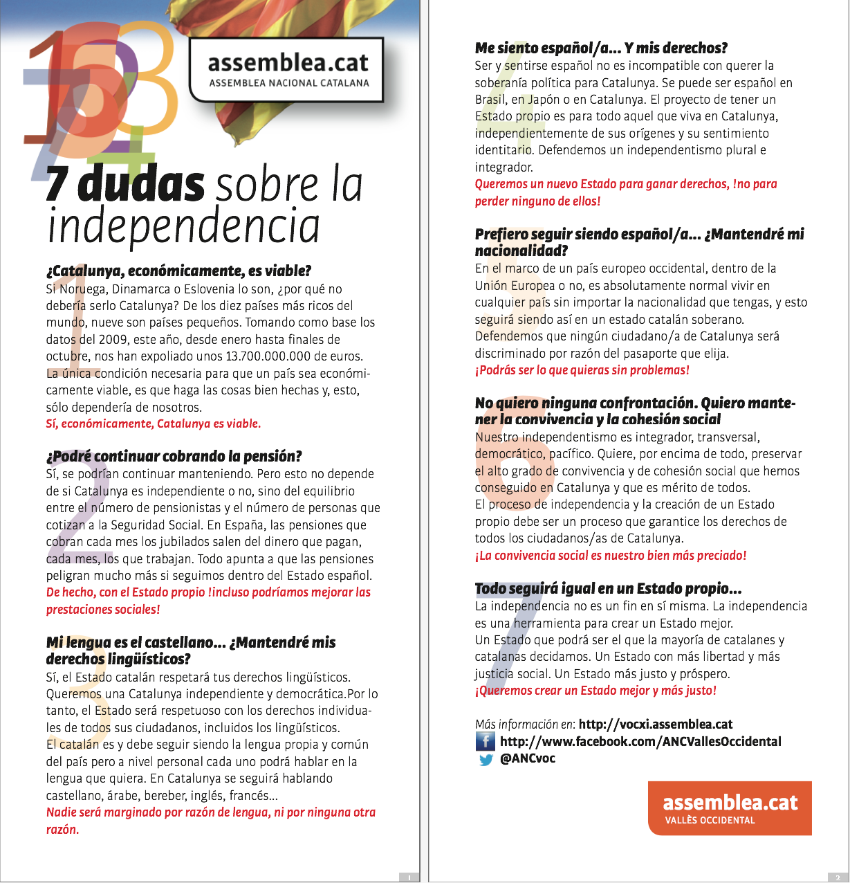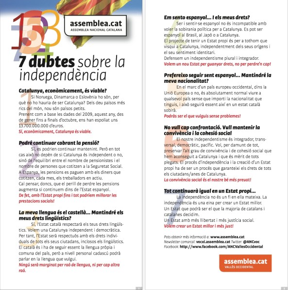 L’Assemblea Nacional Catalana al Vallès Occidental repartirà les pròximes setmanes més de 40.000 fulls que donen resposta als dubtes que més sovint es plantegen sobre la independència.