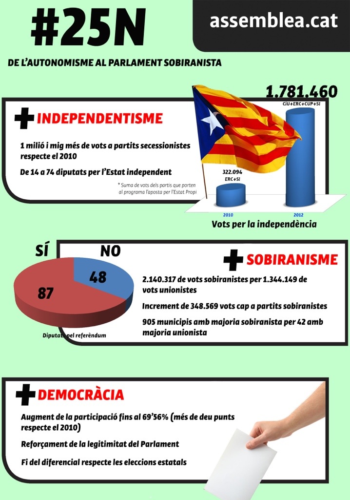 Hem passat d’un Parlament autonòmic a un Parlament sobiranista amb 74 diputats independentistes i 28 unionistes; una fita històrica, i tenim 87 diputats disposats a treballar pel referèndum. El poble català ha demostrat que vol la independència, gairebé un 70% han anat a votar i la majoria ha votat a favor de l’Estat propi. Ens ha d’omplir de satisfacció veure que tenim un país plural i divers que està ben representat dins de l’Assemblea Nacional Catalana.