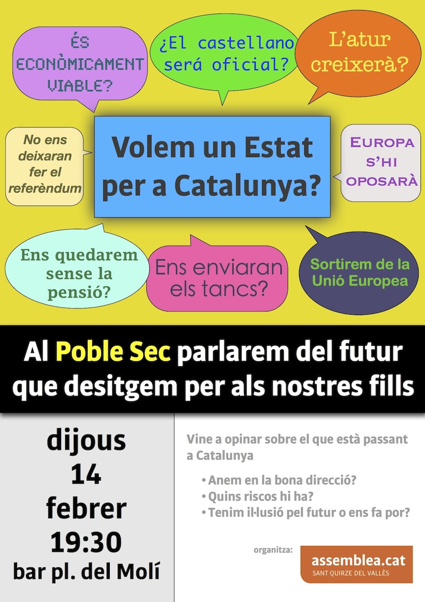 El dijous 14 al barri del Poble Sec de Sant Quirze del Vallès es farà un acte adreçat expressament a aquest barri on debatrem quin futur volem per a Catalunya.