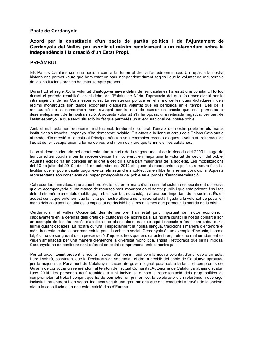 Fins a 8 partits polítics del poble presentaran aquest divendres el Pacte de Cerdanyola, pel qual es comprometen, juntament amb la societat civil i el teixit associatiu del país, a ‘fer posible el dret a decidir’ i a ‘aconseguir el màxim recolzament afirmatiu per l’alliberament nacional’. Mostrant que a la vila hi ha un ampli consens al voltant de l’exercici del dret a l’autodeterminació, Esquerra Republicana de Catalunya, Esquerra Unida i Alternativa, Candidatura d’Unitat Popular, Compromís per Cerdanyola, Convergència Democràtica de Catalunya, Iniciativa per Catalunya Verds, Solidaritat Catalana per la Independència i Unió Democràtica de Catalunya, subscriuran un acord que recorda que Cerdanyola del Vallès ‘ha estat capdavantera en la defensa dels drets dels ciutadans del nostre país’.