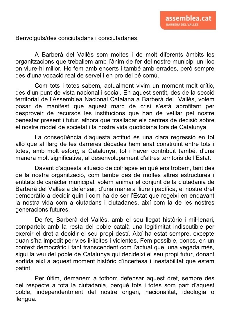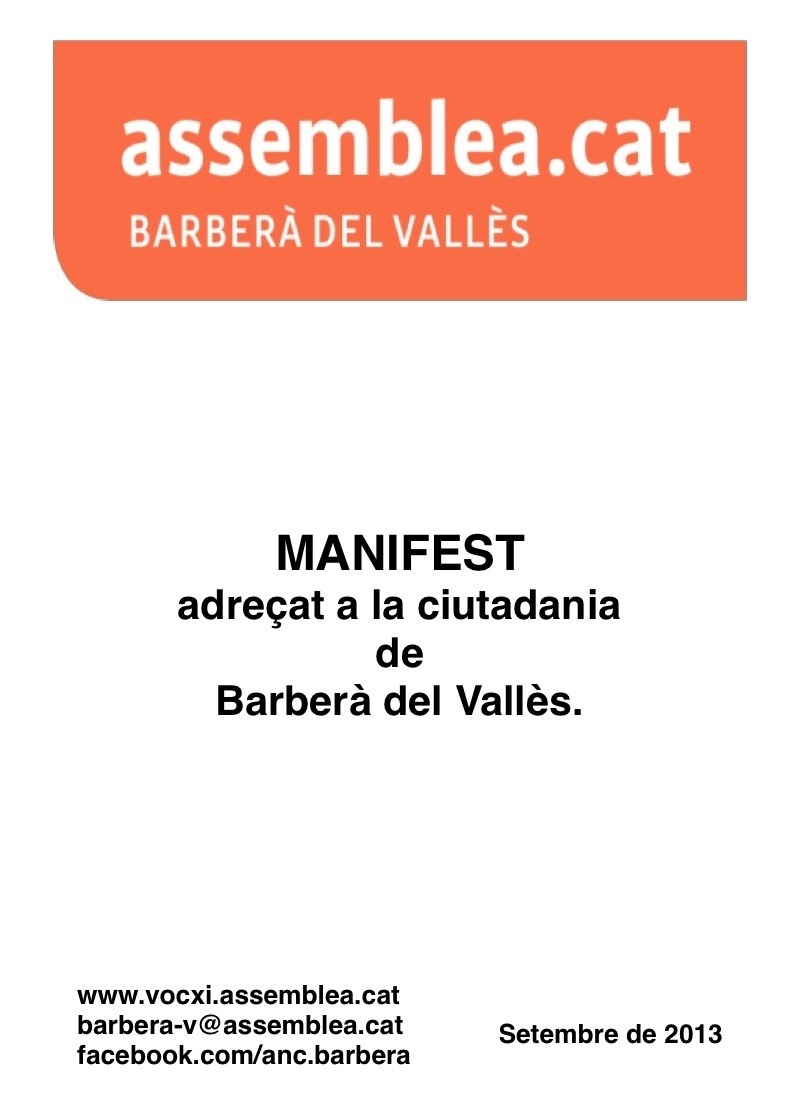 Després de la creació de la secció territorial de l’ANC a Barberà del Vallès i les primeres accions dutes a terme, vam considerar necessari donar-nos a conèixer als ciutadans del nostre municipi, a tots ells a través d’un enviament massiu d’un manifest a favor del dret a decidir.
