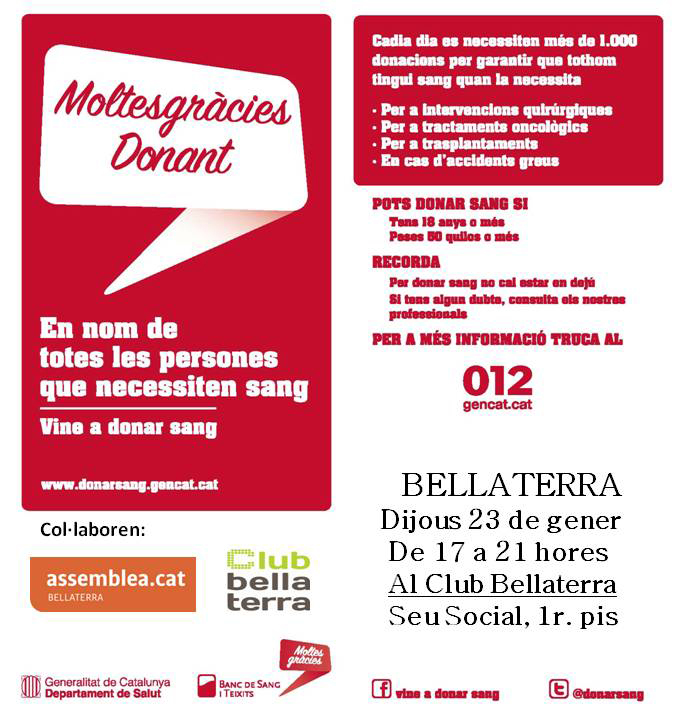 Per això, Bellaterra per la Independència juntament amb el Club Bellaterra col•laborem amb el Departament de Salut de la Generalitat de Catalunya i el Banc de Sang i Teixits en la campanya per aconseguir el màxim nombre de donants de sang. El banc de sang s’instal•larà el dijous 23 de gener de 17 a 21 hores a la Seu Social del Club Bellaterra, plaça del Pi 3 (al costat del supermercat Condis) de Bellaterra.