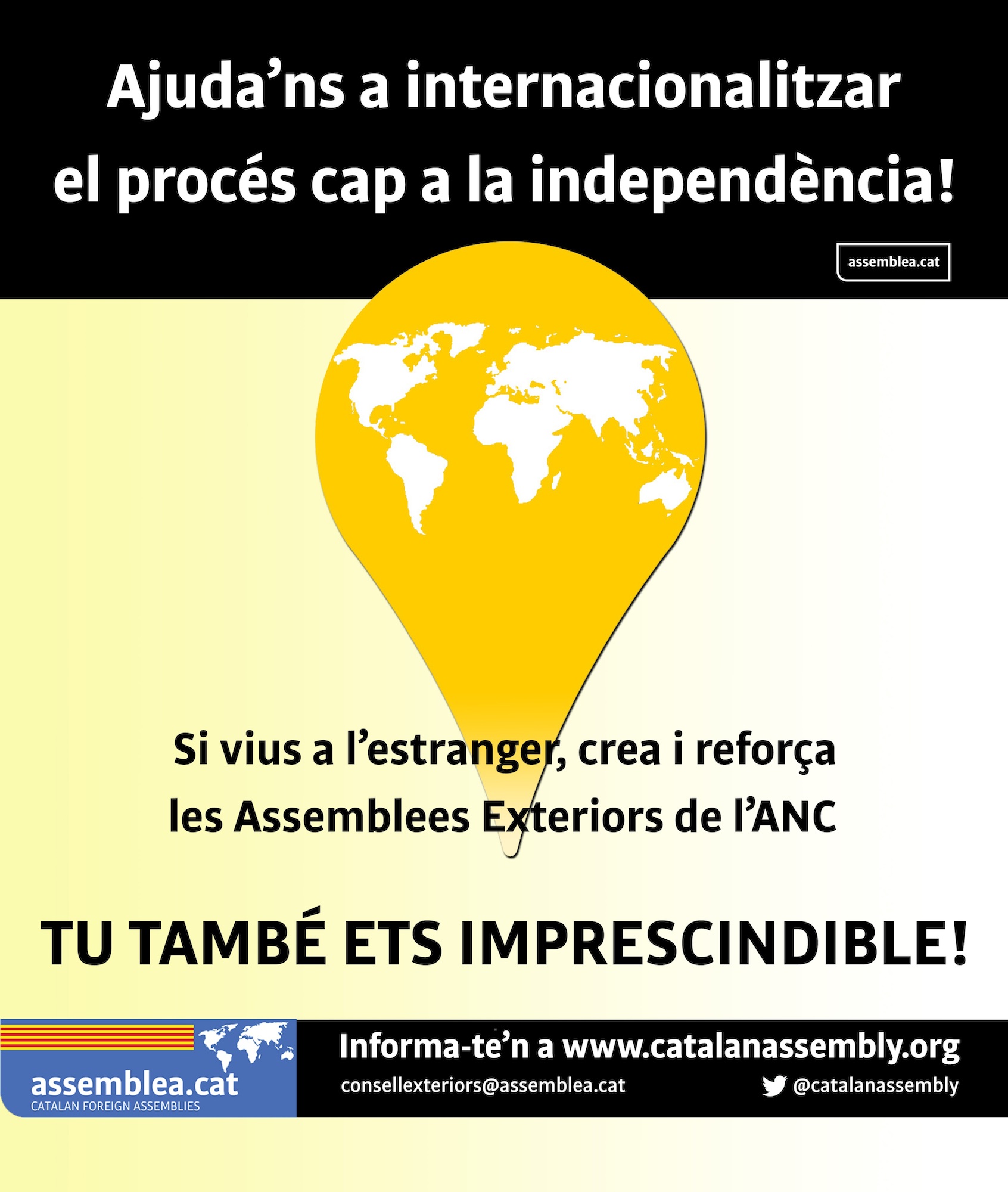 És per això que us demanem que feu arribar aquest missatge als vostres contactes arreu del món, dient-los-hi que són claus en el procés de Catalunya cap a la independència, i que trobaran tota la informació per constituir una Assemblea Exterior a aquesta adreça i tot el suport logístic i d’informació que necessitin a través del correu consellexteriors@assemblea.cat