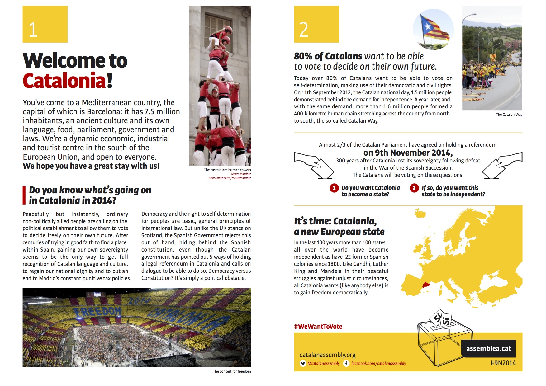 Amb aquesta actuació que s’engloba dins la campanya “De Catalunya al món”, l’ANC pretén fer un pas més en la internacionalització de la causa catalana, remarcant la seva condició pacífica i democràtica i la voluntat de poder votar el futur de Catalunya el proper 9 de novembre del 2014. “Today over 80% of Catalans want to be able to vote on self-determination, making use of their democratic and civil rights. On 11th September 2012, the Catalan national day, 1.5 million people demonstrated behind the demand for independence. A year later, and with the same demand, more than 1,6 million people formed a 400-kilometre human chain stretching across the country from north to south, the so-called Catalan Way” s’explica en el díptic.