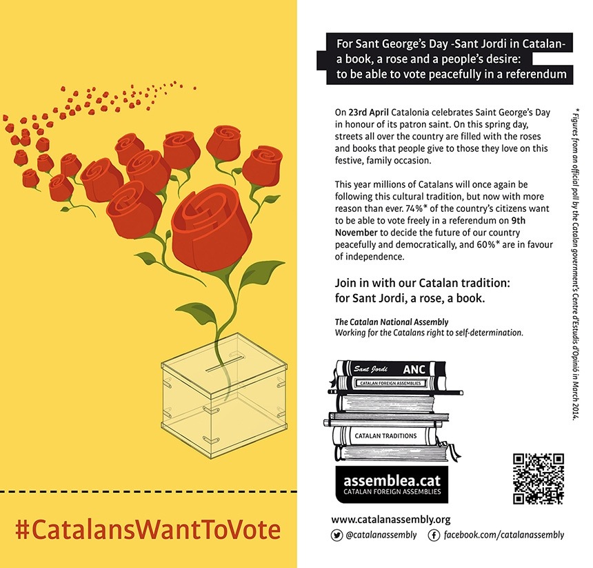 Més enllà de l’arrencada internacional de la campanya Signa un Vot, les Assemblees Exteriors de l’ANC també aprofitaran el Sant Jordi per informar els conciutadans dels països de residència dels emigrants catalans de la voluntat majoritària a la societat catalana de votar en referèndum sobre l’autodeterminació de Catalunya.