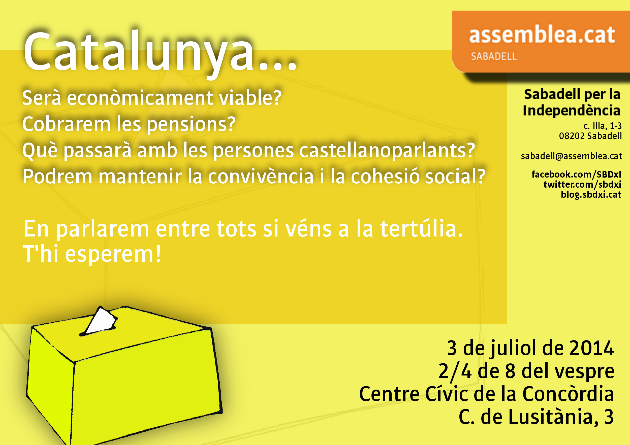 Sabadell per la Independència – ANC, en col·laboració amb l’Agrupació de Veïns de Gràcia i l’Associació de Veïns de Can Feu, hem organitzat un sopar tertúlia, a les 8 del vespre, a la plaça de Joan Morral (vegeu el mapa).
