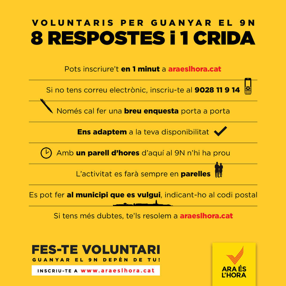 ARA ÉS L’HORA cerca el compromís de fins a 100.000 voluntaris que dediquin un parell d’hores abans del 9N per a col·laborar en la campanya política més important i il·lusionant de la història del país. A dia d’avui més de 30.000 persones ja s’han inscrit com a voluntaris a través del web http://www.araeslhora.cat o al telèfon 9028 11 9 14.