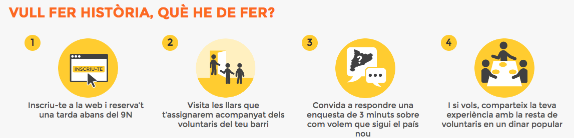 El temps d’implicació dels voluntaris serà mínim. Amb només un parell d’hores des d’ara i fins el 9-N podran garantir l’èxit del Sí a les urnes. Amb sols una tarda es pot canviar la història.