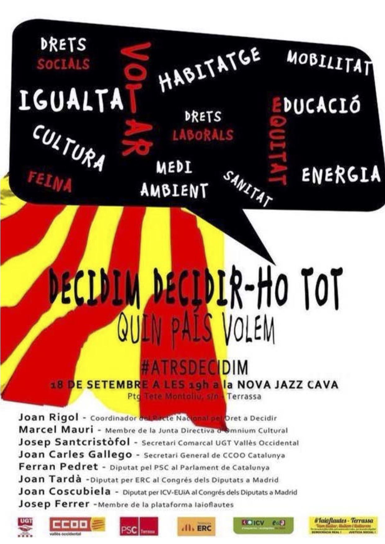 Una gran majoria social de Catalunya ens ha demostrat en els darrers anys que està a favor de l’autodeterminació dels pobles i que reivindica el dret a decidir i vol exercir-lo per tal de recuperar llibertats perdudes. Un moviment transversal tant a nivell territorial com social i polític perquè es sustenta en l’essència de la democràcia i, per tant, insta al Govern i al Parlament a prendre decisions que representin a la majoria dels catalans i de les catalanes. Davant aquesta reivindicació democràtica els partits polítics no s’hi poden girar d’esquena. Un moviment social que ha optat per la via pacífica, pel diàleg, per la defensa ferma d’uns objectius polítics clars, i que respon al genuí caràcter català, moderat però ferm en els seus objectius, vinculat a tota una història i tradició de compromís i activisme per la conquesta del seus drets ciutadans, socials i nacionals.