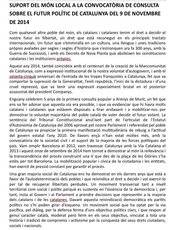 SUPORT DEL MÓN LOCAL A LA CONVOCATÒRIA DE CONSULTA SOBRE EL FUTUR POLÍTIC DE CATALUNYA DEL 9 DE NOVEMBRE DE 2014