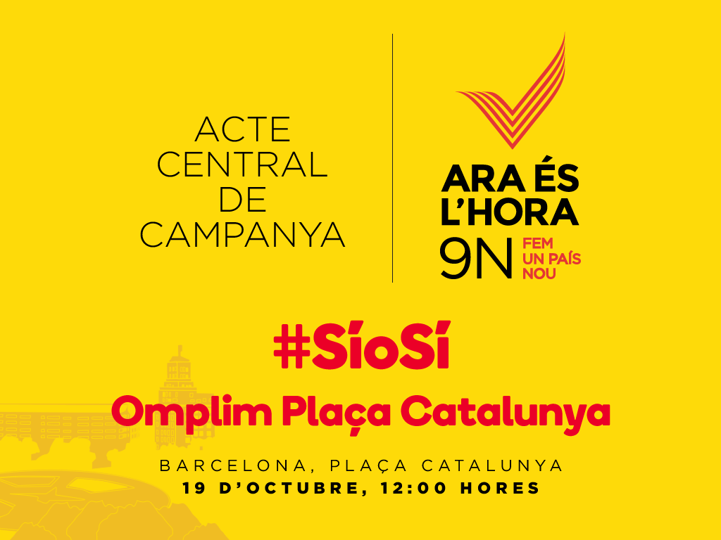 La campanya ARA ÉS L’HORA ha organitzat pel proper diumenge 19 d’octubre un “gran acte massiu” per a mostrar la unitat de cara el 9N omplint la Plaça Catalunya de Barcelona. La jornada servirà per a visualitzar, un cop més, la majoria social que vol construir un país nou.