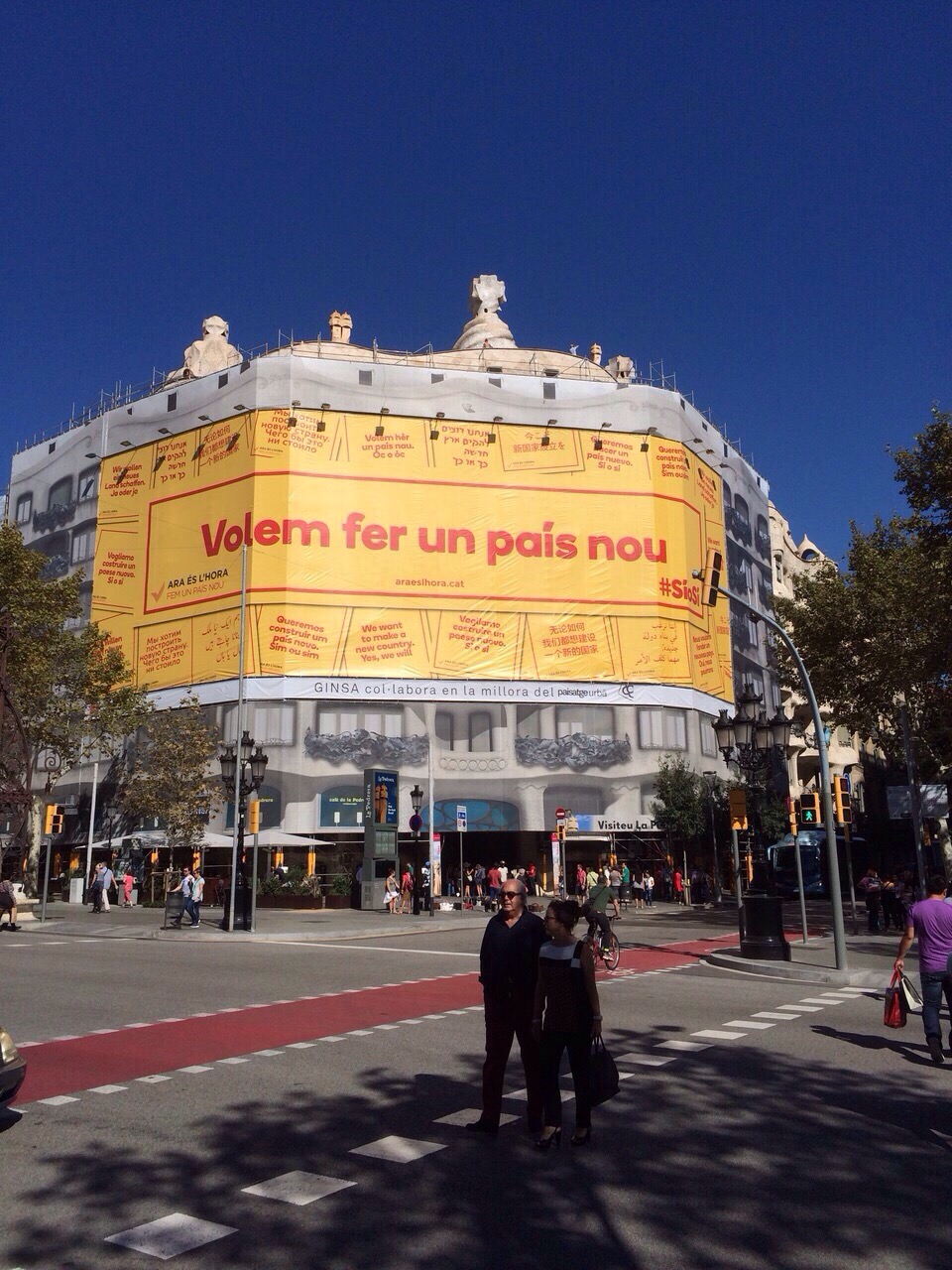 La Pedrera de Barcelona ja llueix, tal com va anunciar ARA ÉS L’HORA, una lona gegant amb la inscripció ‘Volem fer un país nou #SíoSí’ com a part de la campanya que pretén tenyir de groc el territori i descobrir el país nou que imaginen els catalans.