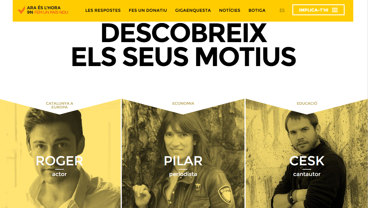 En l’espai habilitat a la xarxa per la campanya unitària impulsada per l’ANC i Òmnium també s’hi poden trobar els activistes del moviment pels drets dels homosexuals Eugeni Rodríguez i Carme Porta i Saoka Kingolo, lluitador pels drets de les persones que han arribat des d’altres llocs del món. També hi és l’Emma, la noia que va votar al vèrtex de la V el passat 11 de setembre i els emprenedors Genís Roca i Josep M. Ganyet.