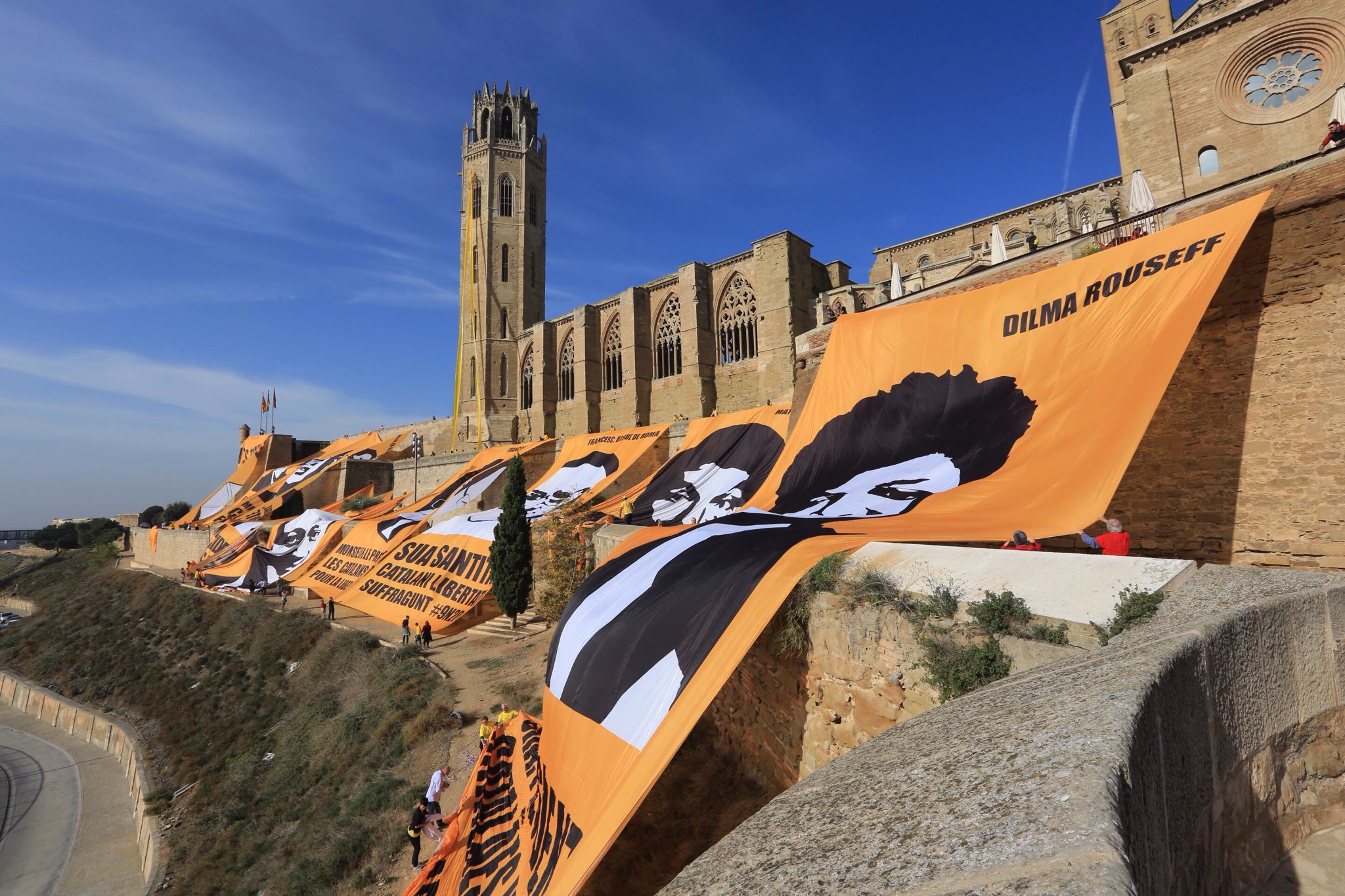 A més, la Seu Vella de la capital del Segrià s’ha tenyit de groc a través de l’estesa de les lones dirigides als principals mandataris internacionals i la col·locació de diferents elements grocs, el color que ARA ÉS L’HORA vol associar a la democràcia i la llibertat. En l’acte central de la campanya a les terres de Ponent hi han participat Josep Colomer (ANC), Quim Torra (Òmnium) i l’escriptor Pep Coll.
