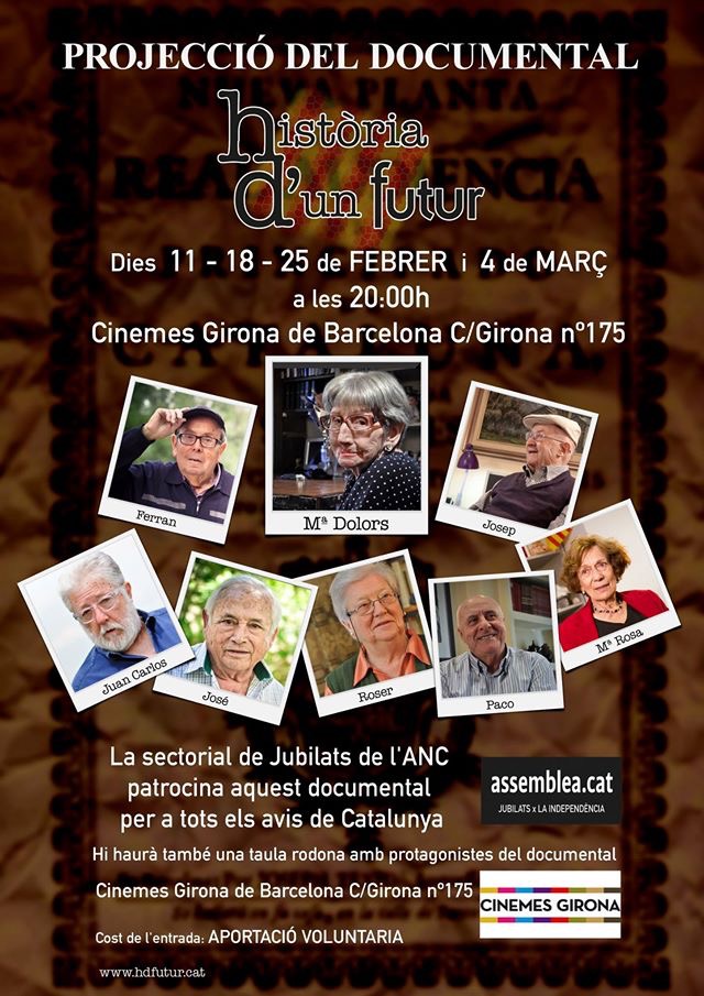 La Sectorial de l’Assemblea Nacional Catalana (ANC), Jubilats per la Independència, patrocina la projecció el proper 11 de febrer a les 20 hores el documental ‘Història d’un futur’ als Cinemes Girona de Barcelona per tal d’incidir en la rellevància dels arguments envers un col·lectiu clau en la consecució d’una àmplia majoria favorable a la construcció d’un estat català com és el de la gent gran.