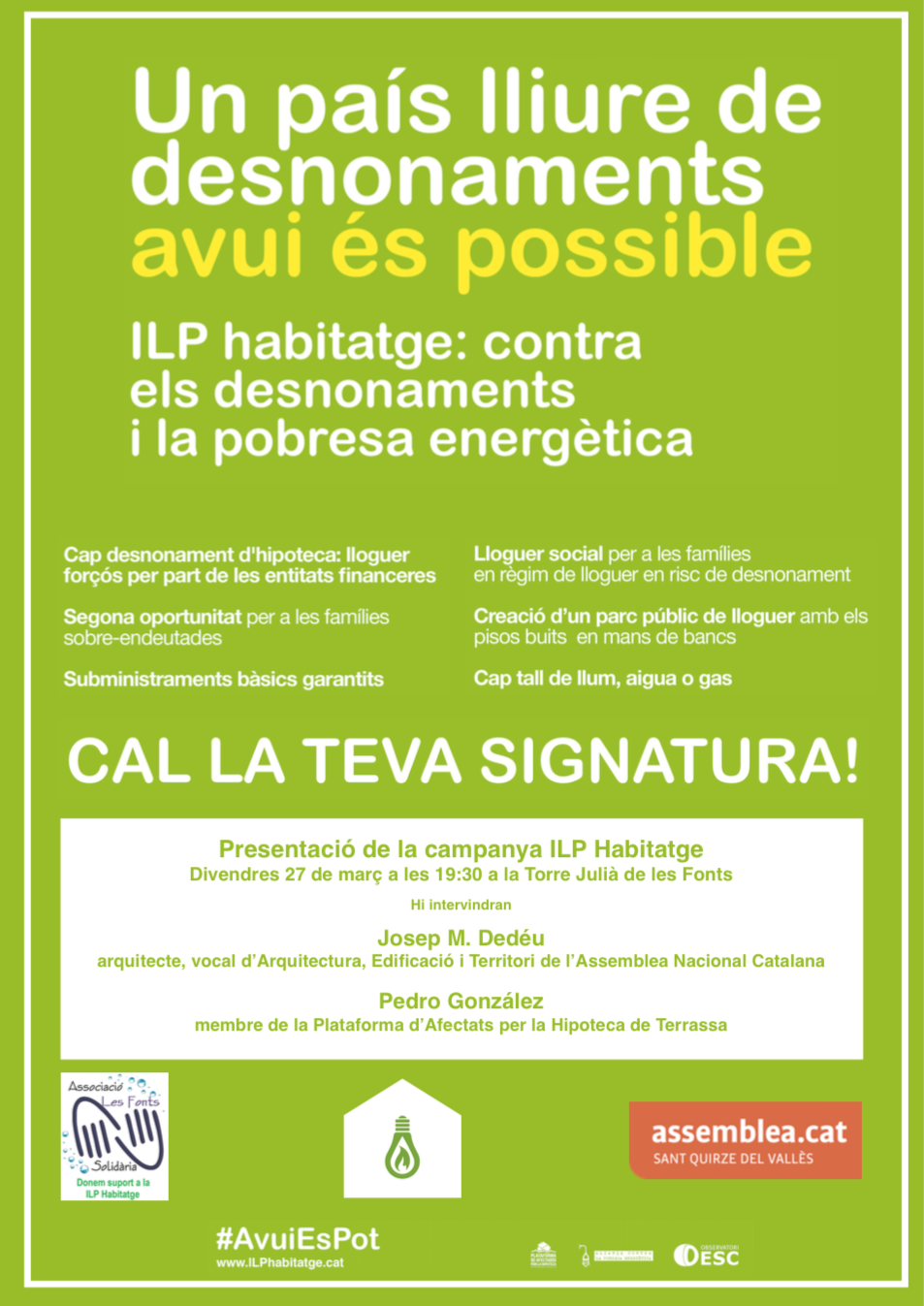 L’acte compta amb el suport de Les Fonts Solidària i tindrà la presència de Josep M Dedéu de la sectorial d’Arquitectura de l’ANC i de Pedro González de la Plataforma d’Afectats per la Hipoteca de Terrassa.