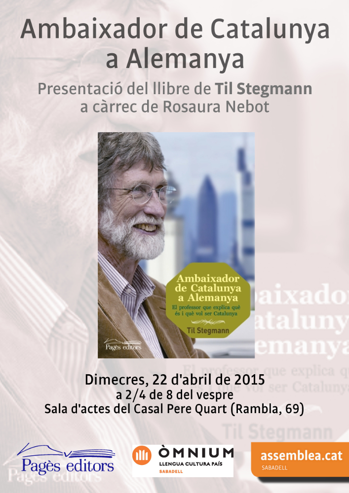 Tenim el goig de comunicar-vos que el proper dimecres 22 d’abril, just abans de Sant Jordi, tindrem Til Stegmann a Sabadell presentant-nos el seu darrer llibre Ambaixador de Catalunya a Alemanya.