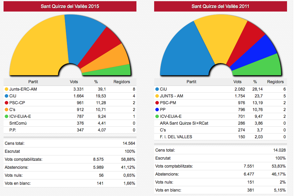 Pel que fa a les formacions votades, la victòria clara de Junts per Sant Quirze i el segon lloc de CiU, tots dos signants de Compromís de l’ANC “Els ajuntaments per la independència”, és un resultat magnífic.