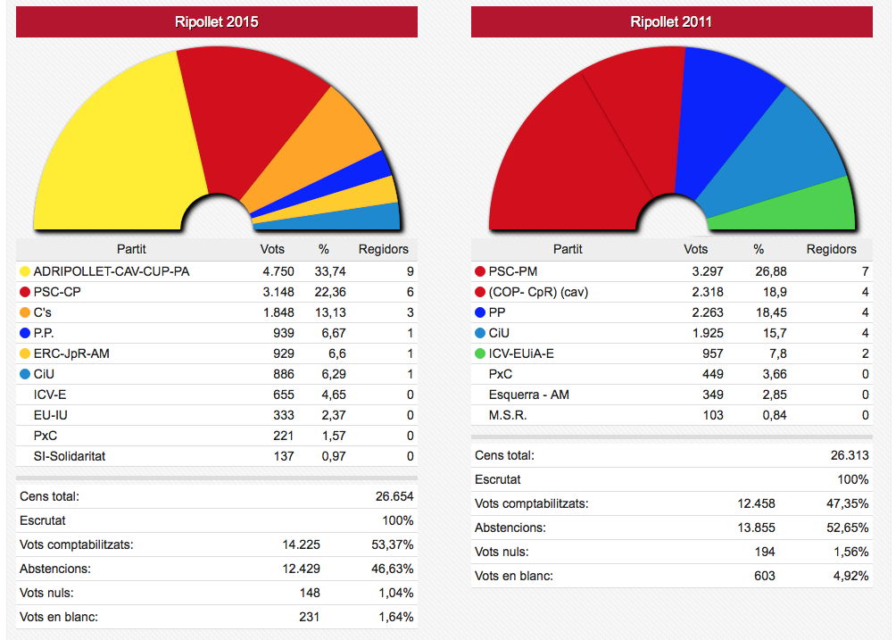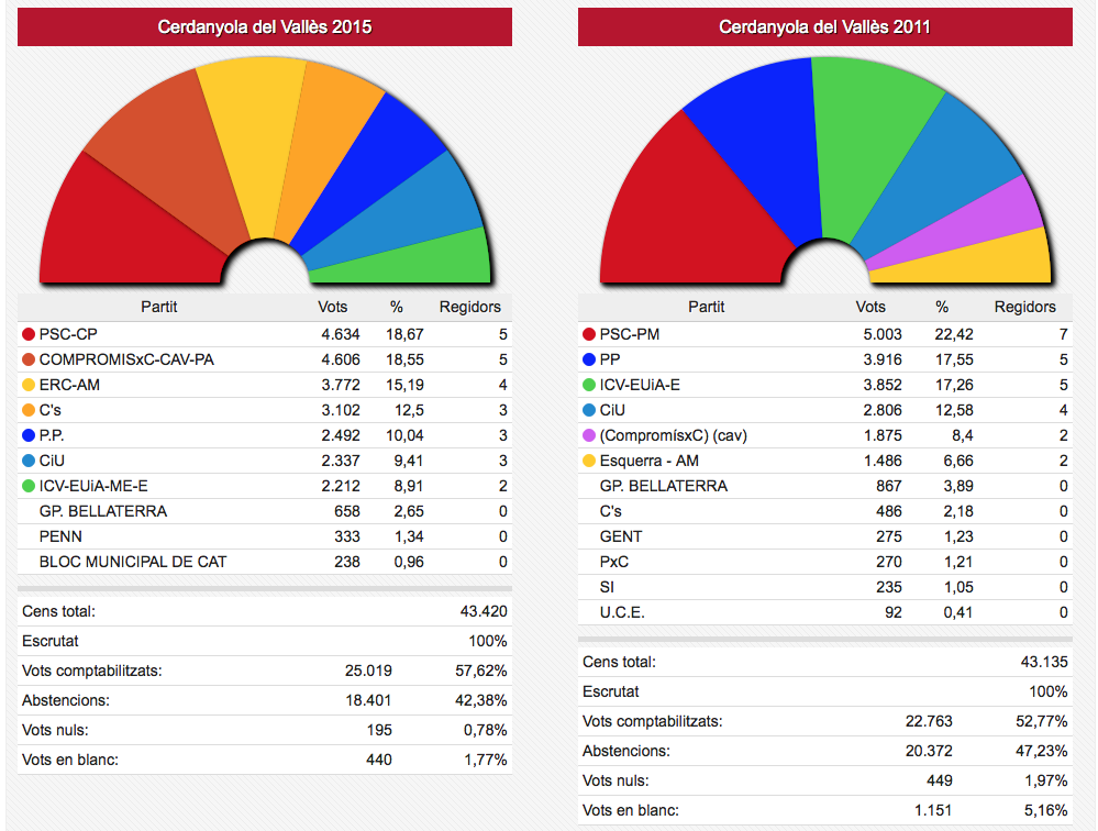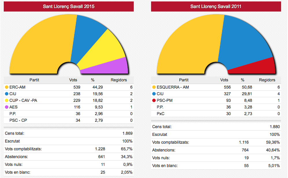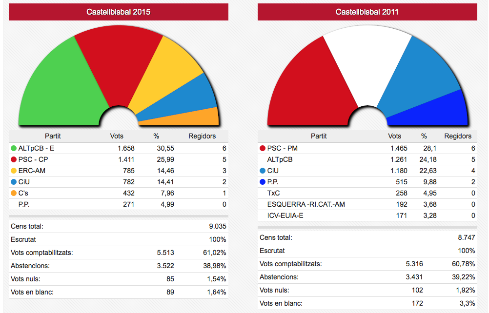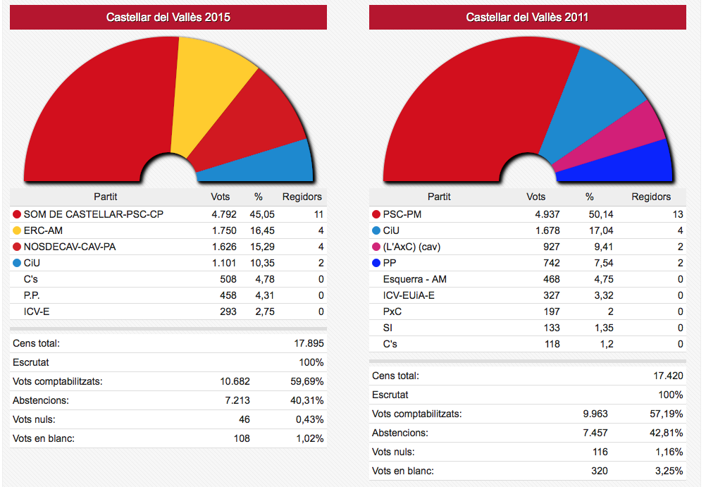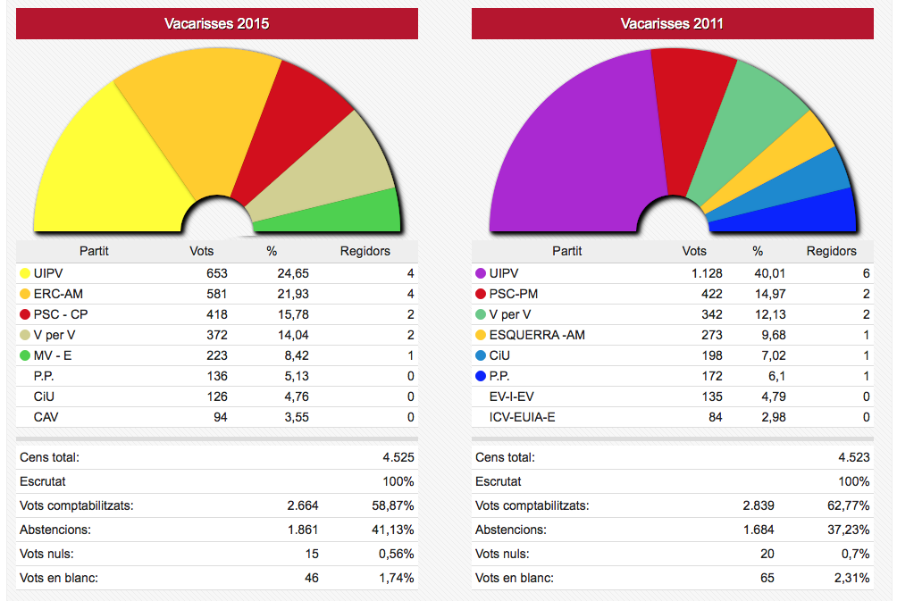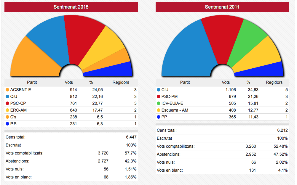 Els vots recollits de les dues formacions passen de sumar 3.836 vots el 2011 a sumar-ne 4.995 ara. En nombre de regidors aquestes dues formacions han passat d’11 a 12 sobre un total de 17.