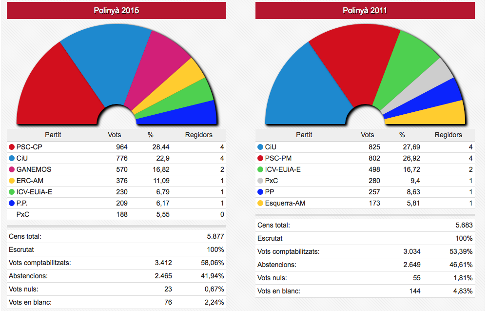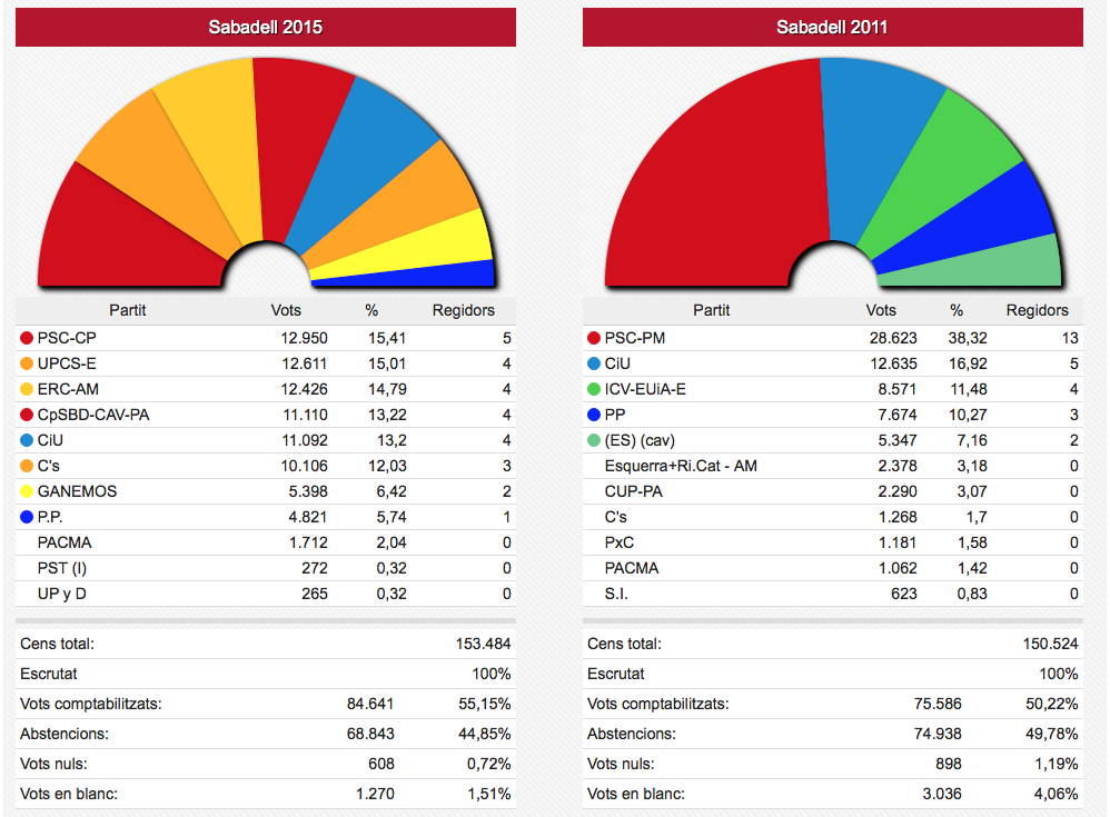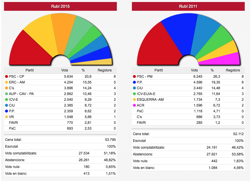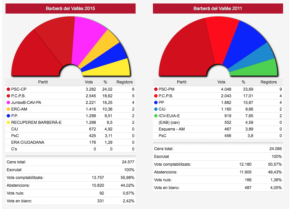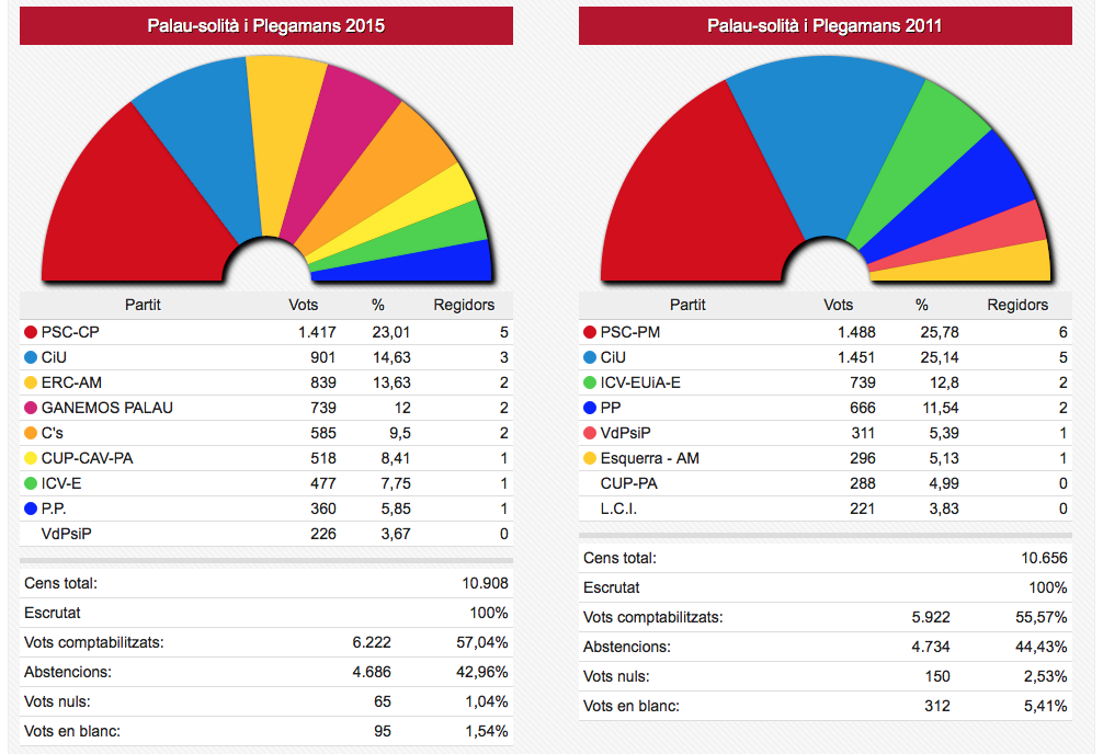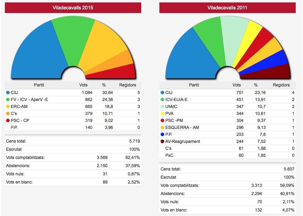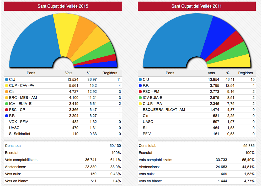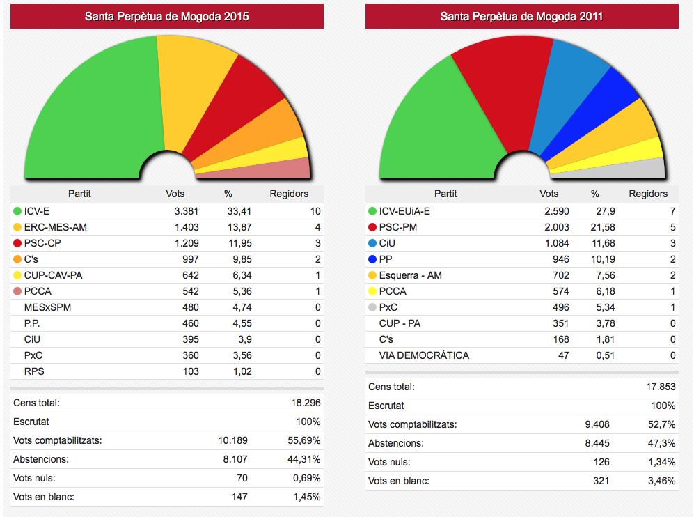 Els vots recollits de les dues formacions passen de sumar 3.836 vots el 2011 a sumar-ne 4.995 ara. En nombre de regidors aquestes dues formacions han passat d’11 a 12 sobre un total de 17.