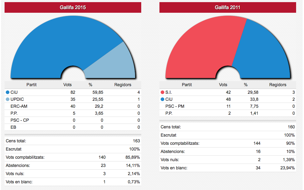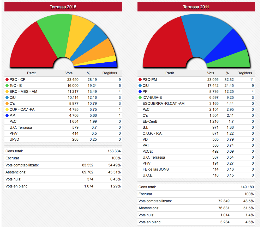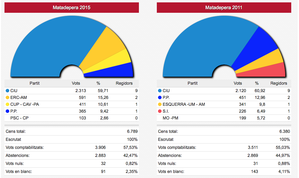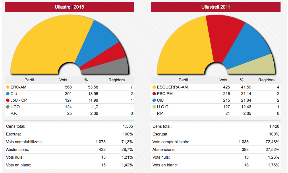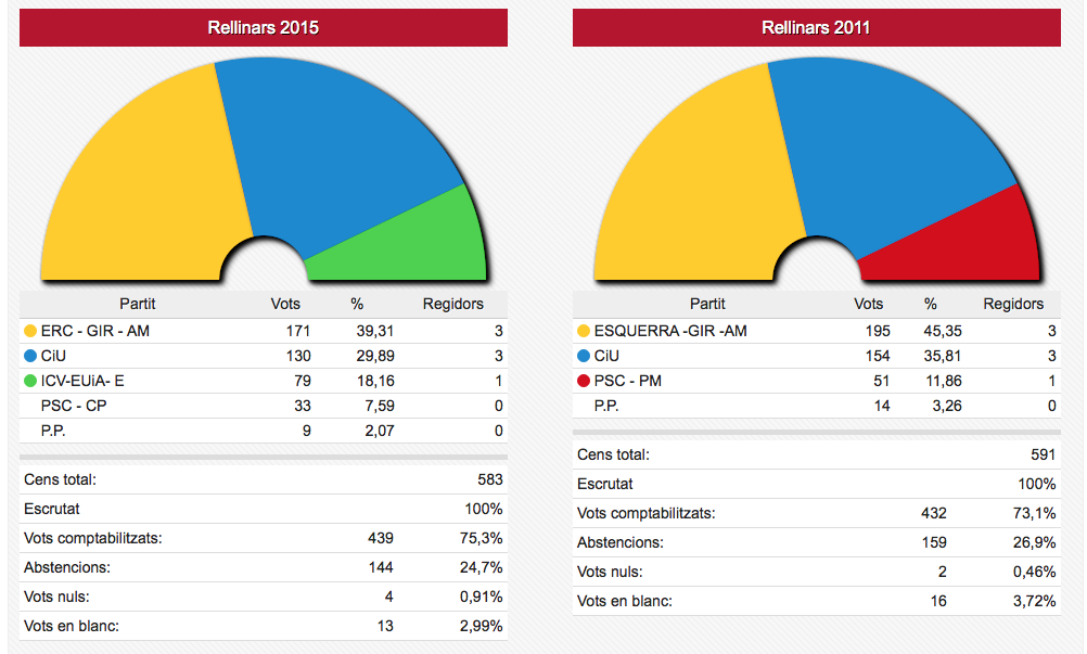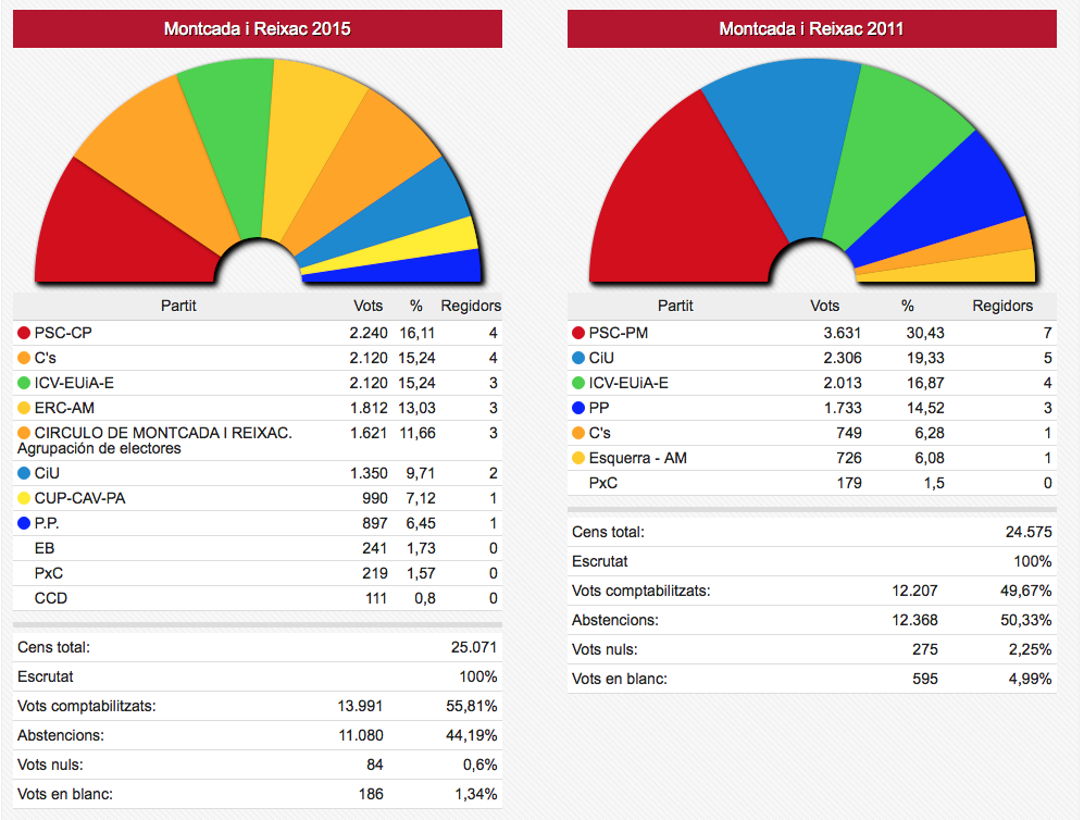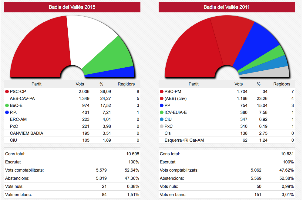 Els vots recollits de les dues formacions passen de sumar 3.836 vots el 2011 a sumar-ne 4.995 ara. En nombre de regidors aquestes dues formacions han passat d’11 a 12 sobre un total de 17.