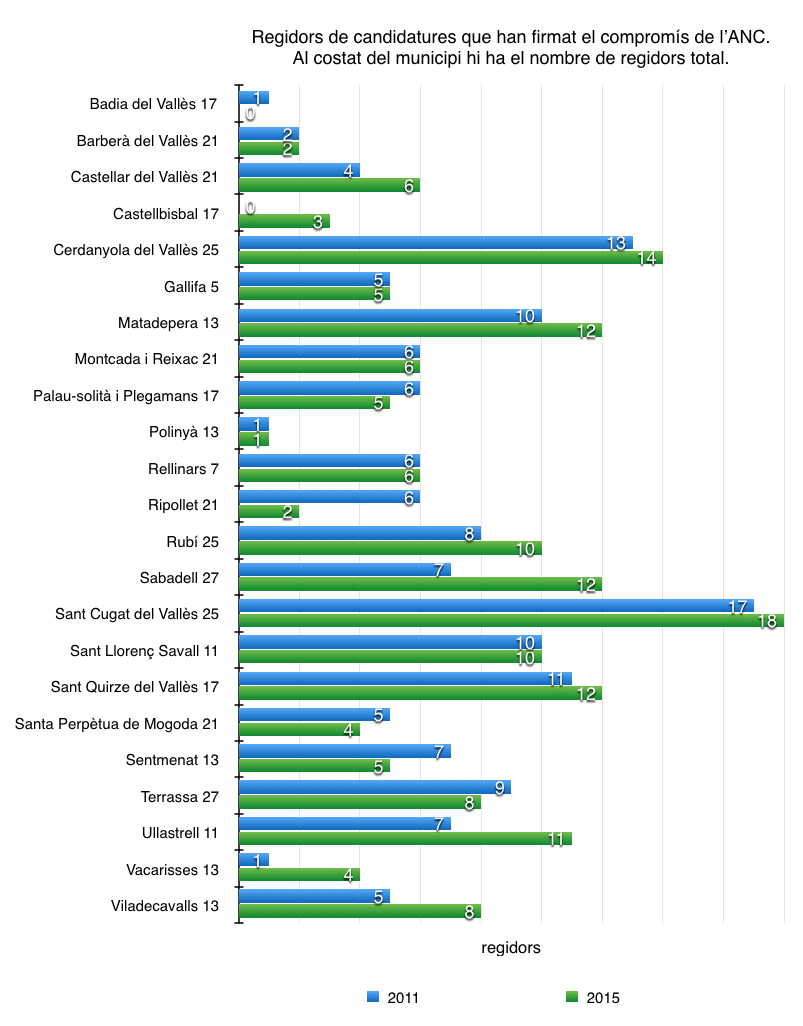 En aquest gràfic podeu veure l’evolució del nombre de regidors de candidatures que han signat els Compromís de l’ANC que han sortit escollits en les municipals 2015. Podeu comparar-ho amb les del 2011.