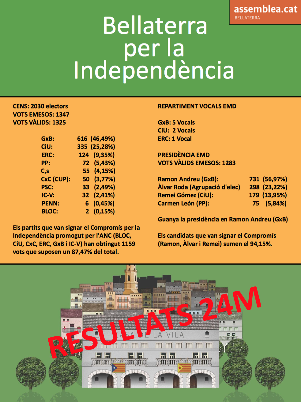 Aquests resultats asseguren tenir una alcaldessa independentista i compromesa amb el procés d’autodeterminació que viu el Principat. Tampoc hi haurà cap acord de govern municipal amb forces contràries a la independència o al dret a decidir. Les àmplies majories sobiranistes s’hauran de veure al ple cada cop que calgui.