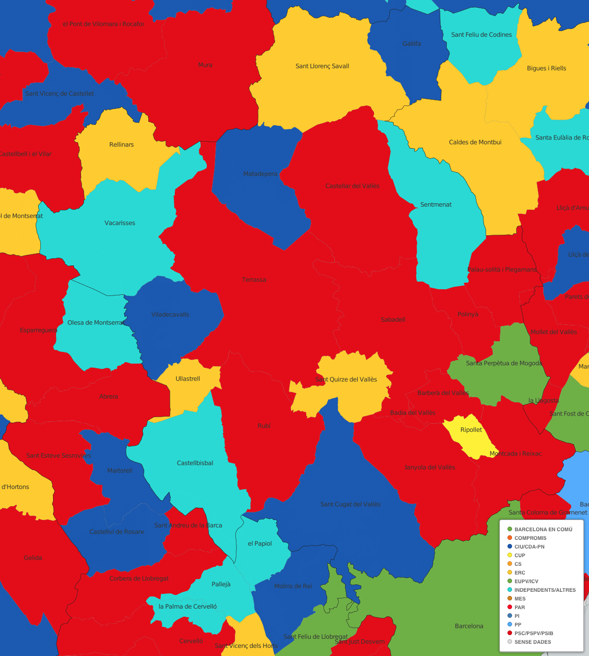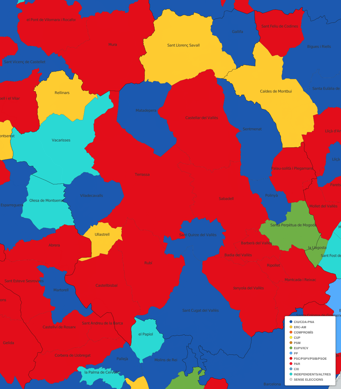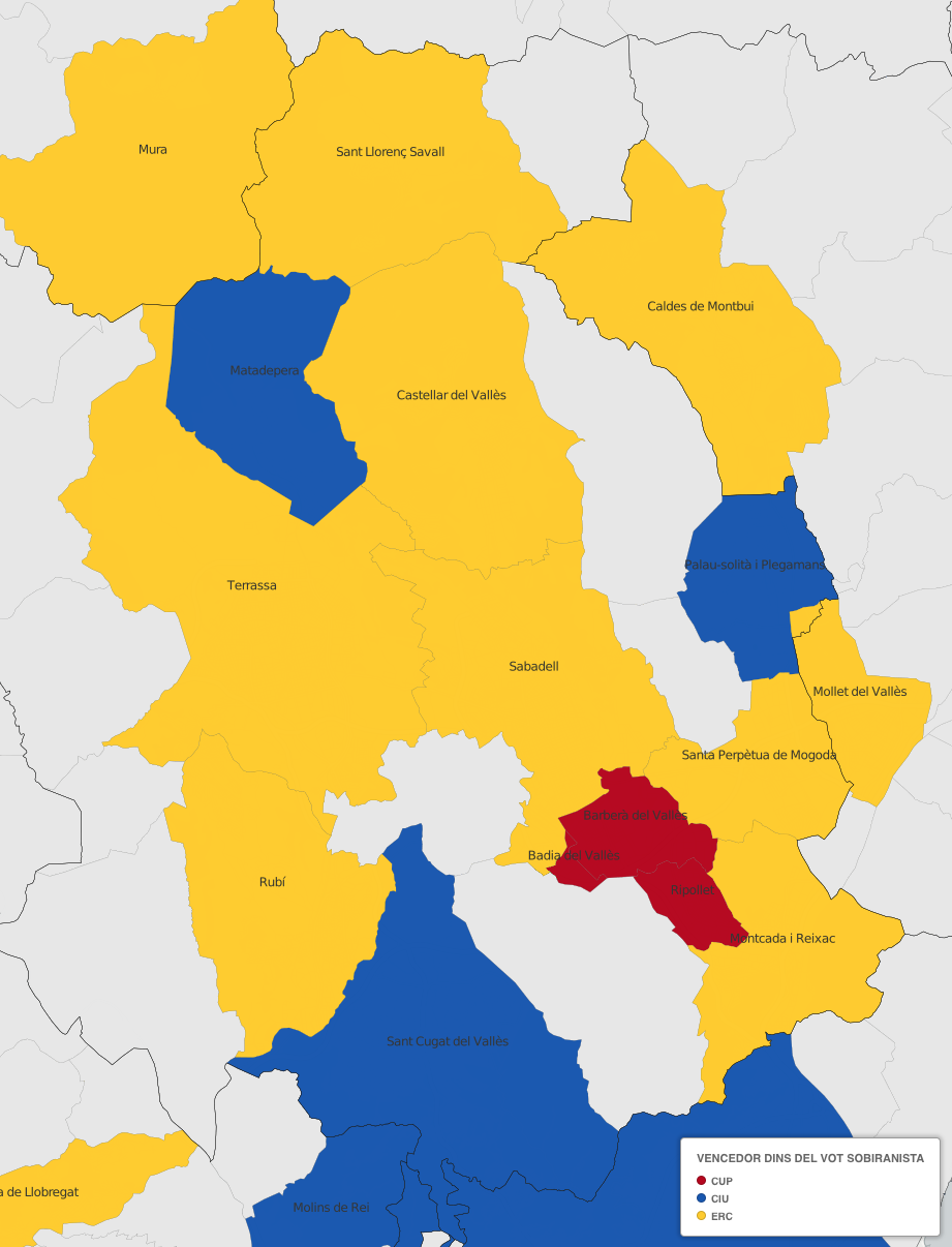 Font: Vilaweb Vilaweb a elaborat una sèrie de mapes per interpretar gràficament les eleccions municipals del 24 de maig. Us passem les ampliacions pel Vallès Occidental.