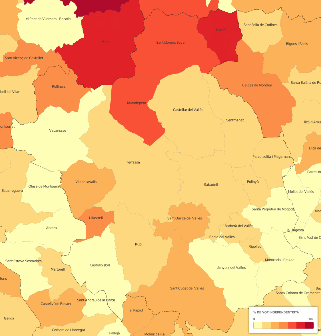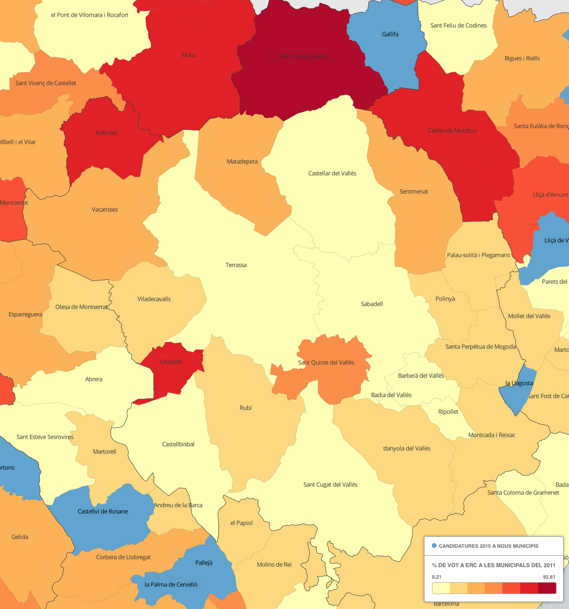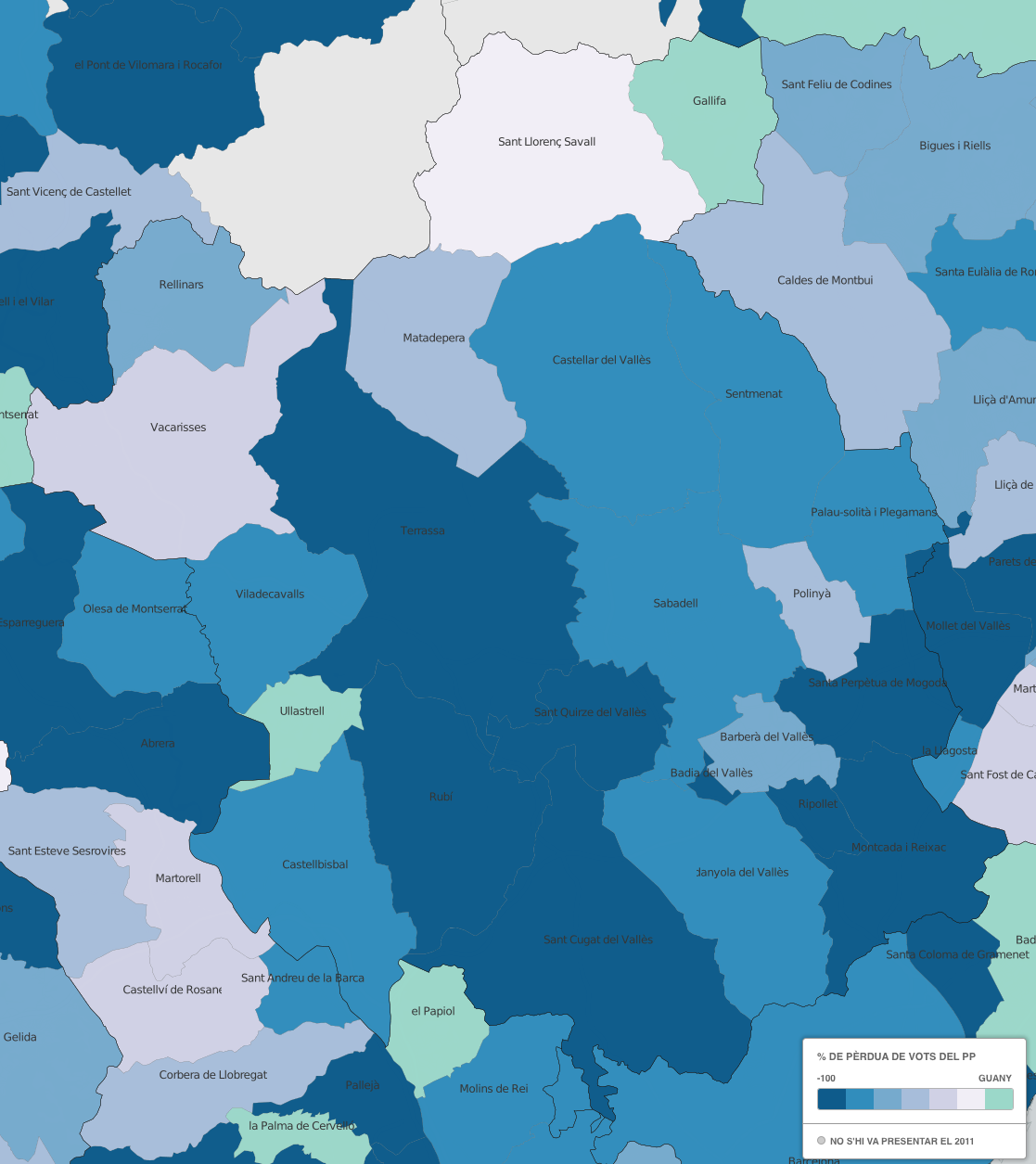 Font: Vilaweb Vilaweb a elaborat una sèrie de mapes per interpretar gràficament les eleccions municipals del 24 de maig. Us passem les ampliacions pel Vallès Occidental.