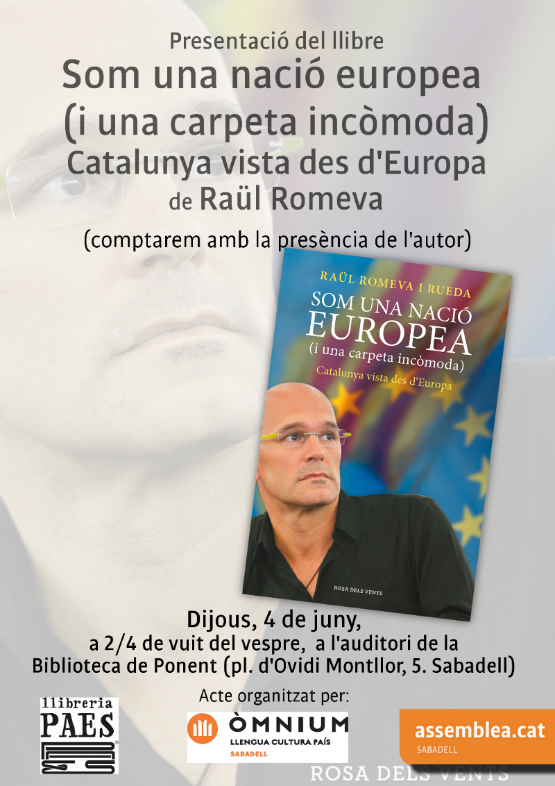 Us convidem a la presentació del llibre Som una nació europea (i una carpeta incòmoda). Catalunya vista des d’Europa de Raül Romeva. Serà el dijous, 4 de juny, a dos quarts de vuit del vespre,  a l’auditori de la Biblioteca de Ponent (pl. d’Ovidi Montllor, 5. Sabadell) i comptarem amb la presència del mateix autor, Raül Romeva, que ens parlarà sobre com es veu el procés català des de les instàncies de la Unió Europea.