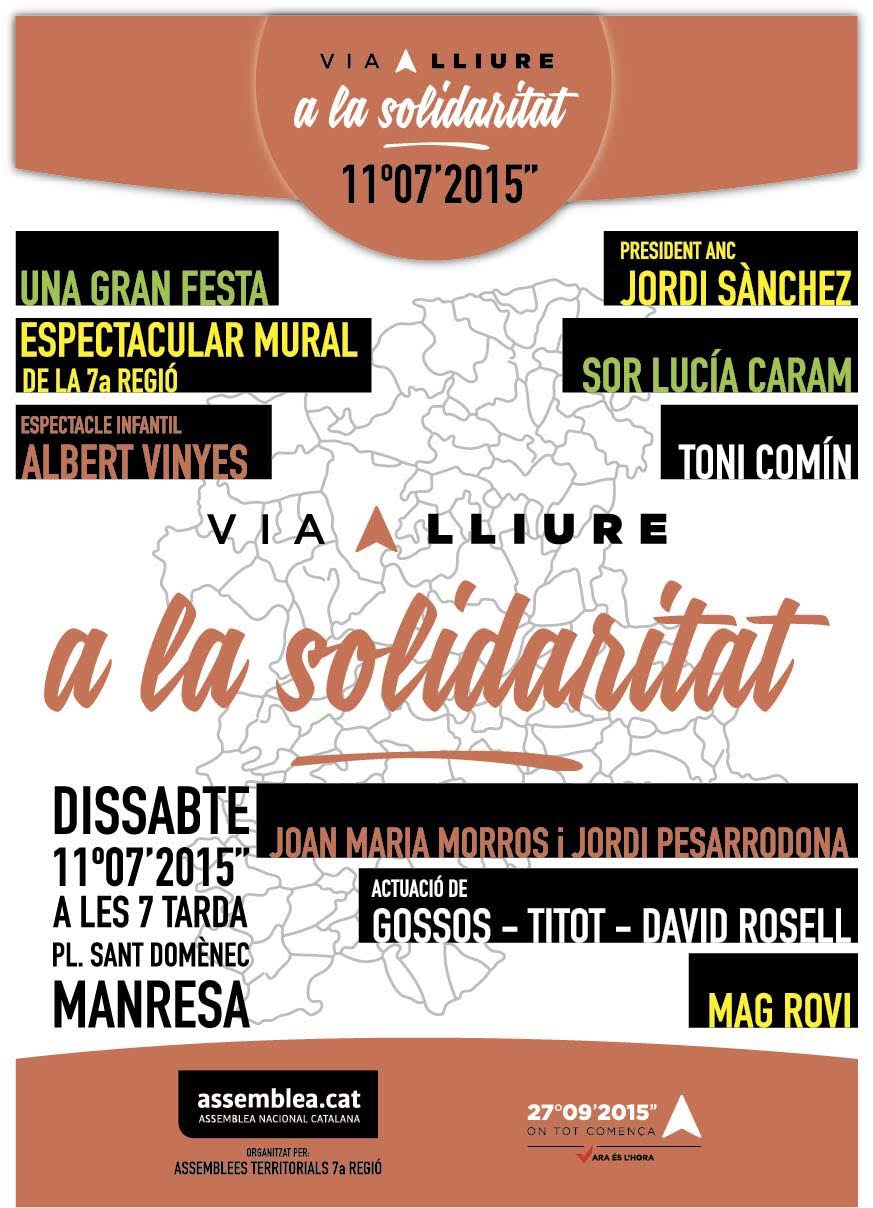L’acte a Manresa comptarà amb la presència del president de l’Assemblea, Jordi Sànchez, Sor Lucía Caram i Toni Comín; a més de les actuacions de David Rossell, Titot i el mag Roví (dissabte 11 de juliol, plaça Sant Domènec, 19.00)