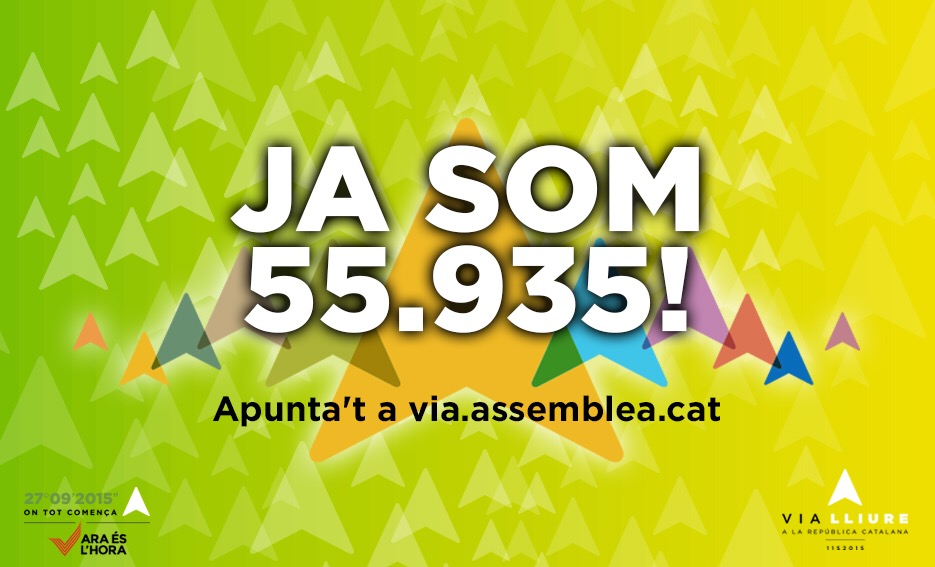 El nombre d’inscrits a la ‘Via Lliure’que organitza l’Assemblea Nacional ja supera els 50.000. De fet, aquest matí ja eren prop de 56.000 els assistents confirmats a la Diada que enguany omplirà la Meridiana de colors i obrirà una Via cap al Parlament per a dur-hi simbòlicament els diversos eixos de debat que aquest estiu recorren el territori.