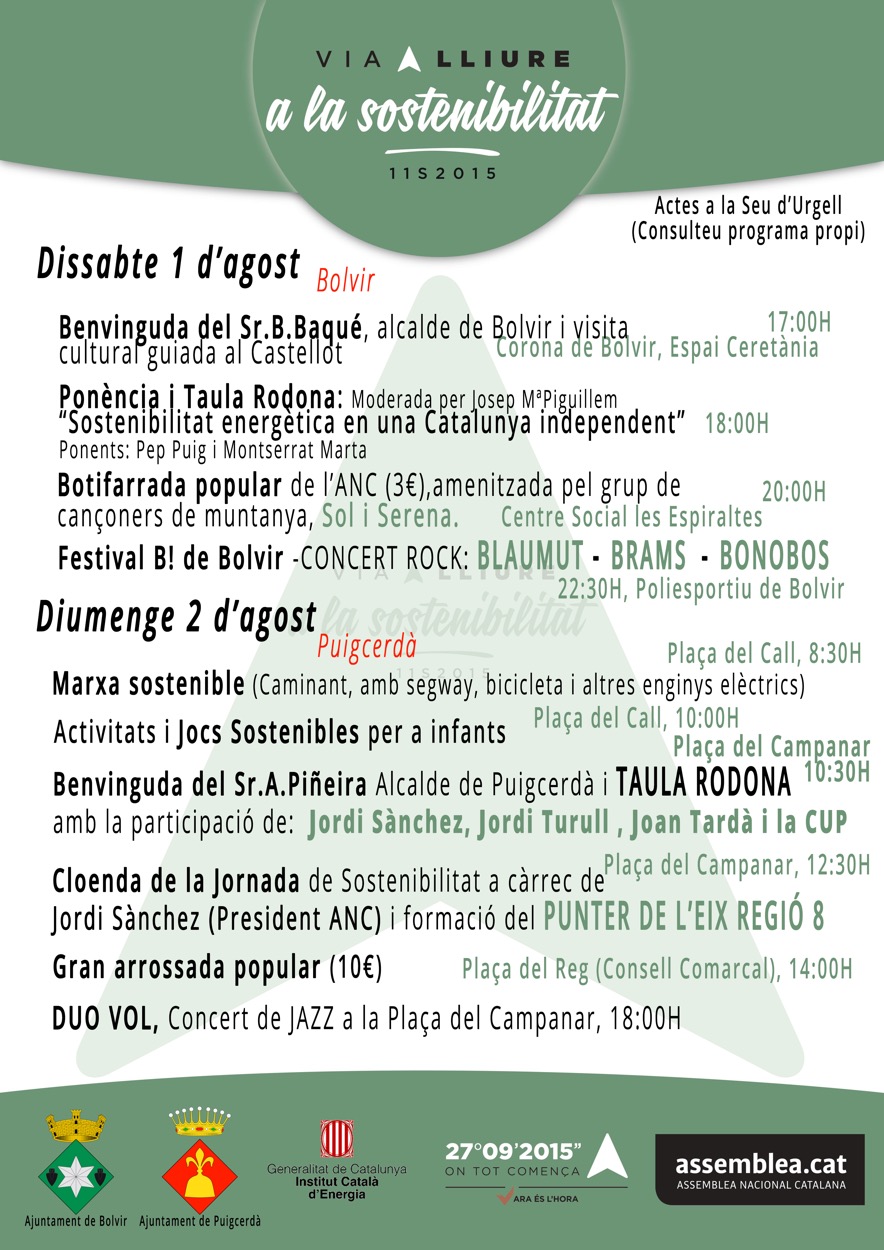 D’entre els actes organitzats en destaquem la taula rodona (dissabte 18.00) en què es debatrà sobre la ‘Sostenibilitat energètica en una Catalunya independent’, moderada per Josep Mª Piguillem, que comptarà amb les intervencions de Pep Puig i Montserrat Marta.