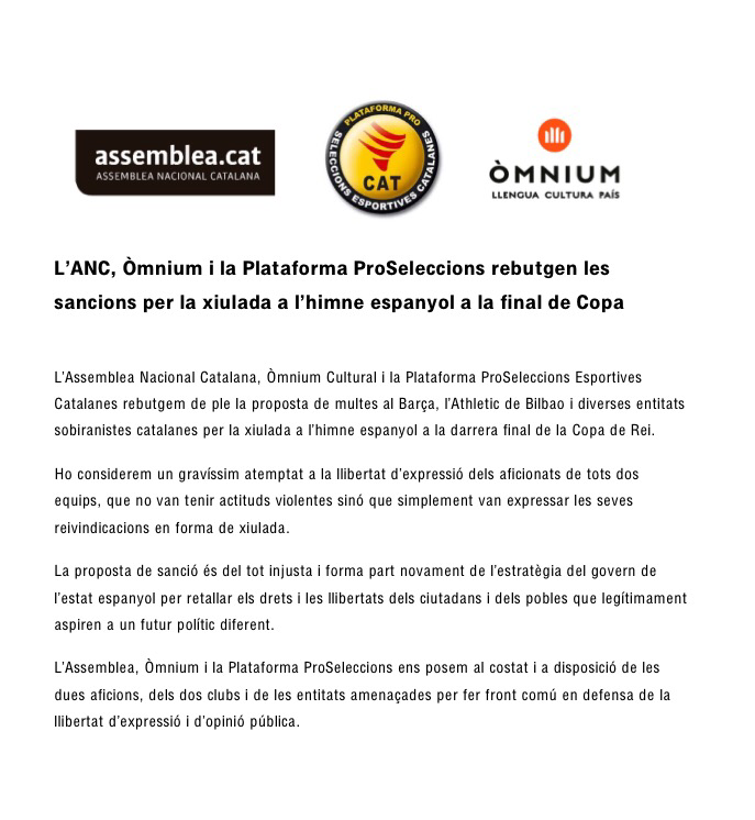 L’Assemblea Nacional Catalana, Òmnium Cultural i la Plataforma ProSeleccions Esportives Catalanes rebutgem de ple la proposta de multes al Barça, l’Athletic de Bilbao i diverses entitats sobiranistes catalanes per la xiulada a l’himne espanyol a la darrera final de la Copa de Rei.